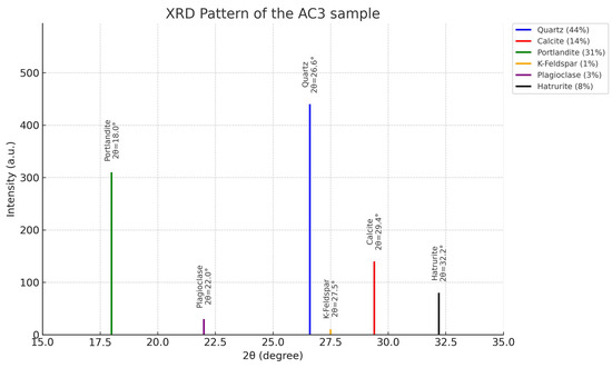 To determine the reasons for the increased strength and stability of the aerated concrete product, the mineralogical compositions of the crystalline phases of the control sample (Figure 11 and Table 6) and the most optimal sample AC3 (Figure 12 and Table 7) were analysed.