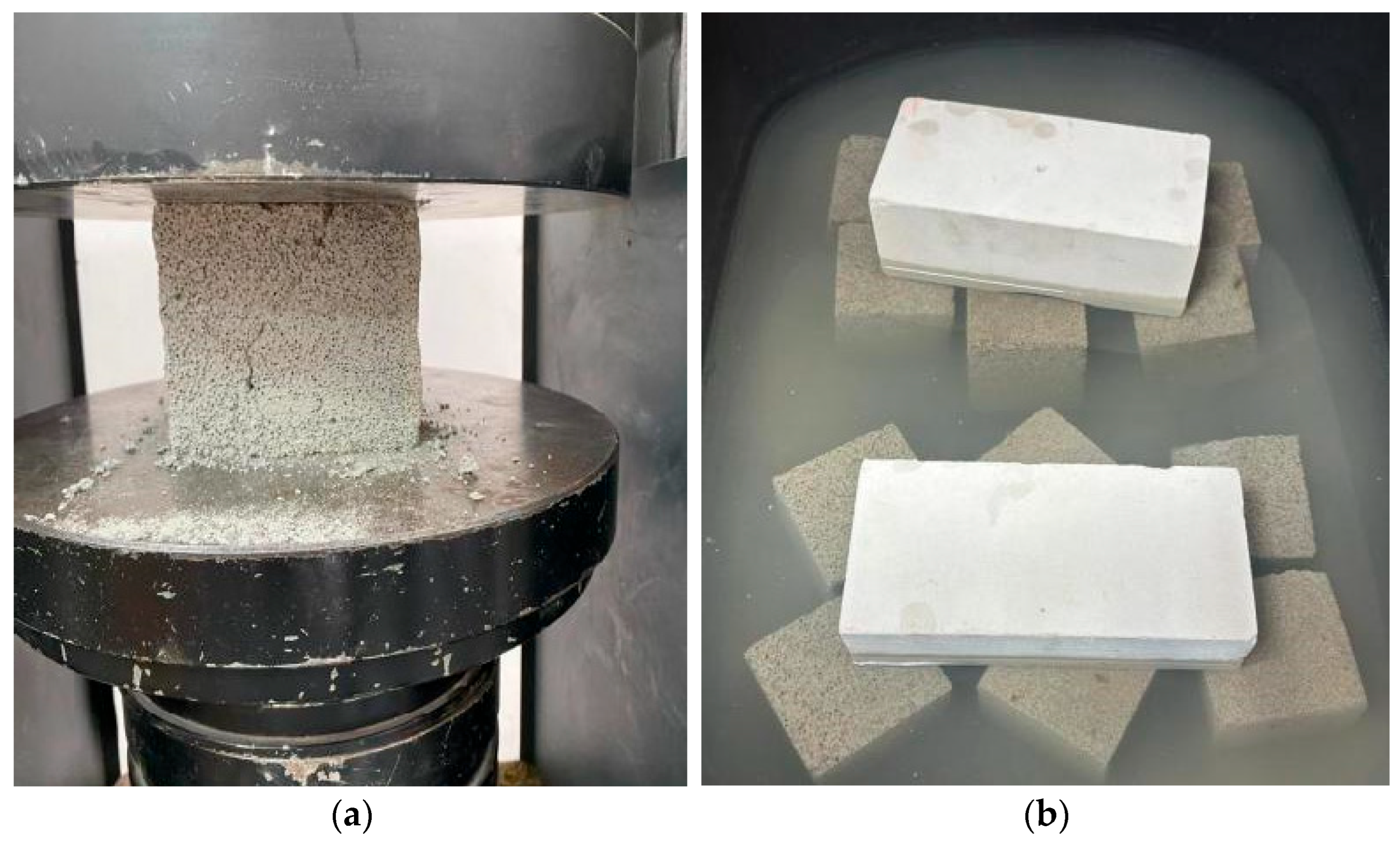 21]. The tests were performed on cube-shaped specimens with dimensions of 100 × 100 × 100 mm. The water absorption capacity was evaluated by immersing the samples in water until full saturation was achieved. Full water saturation was determined by stabilising the mass of the saturated sample: a mass change of no more than 1% after 24 h of water immersion was considered as the saturation criterion.