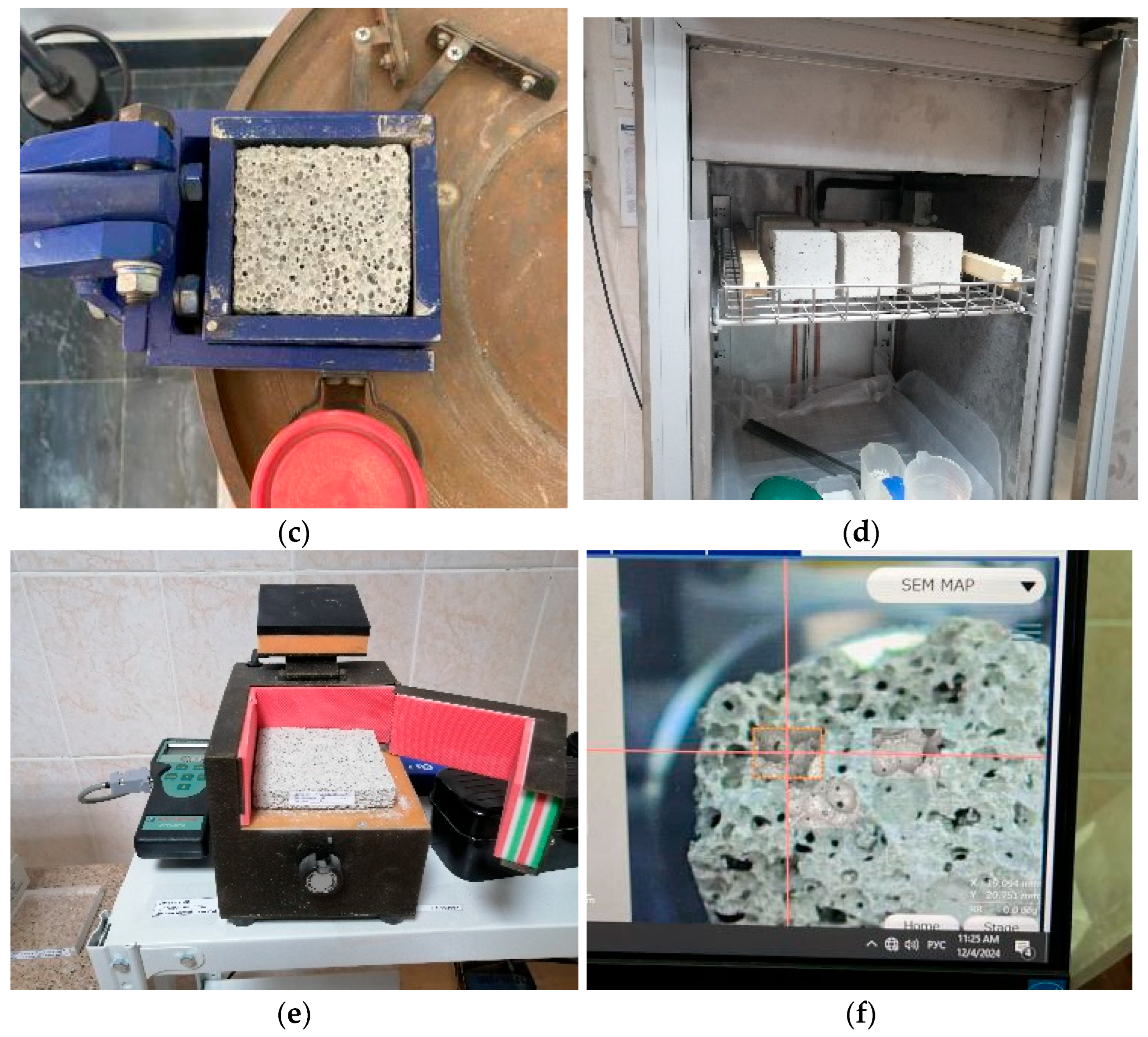 Figure 2f). The equipment used has calibration certificates, and it allows for accurate measurements of the mechanical properties of cellular concrete, which is crucial for assessing its performance properties and durability in construction.