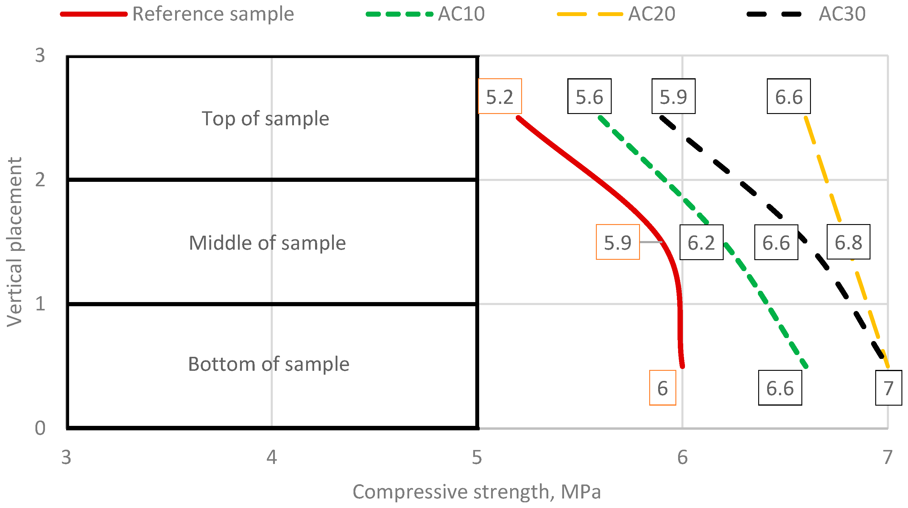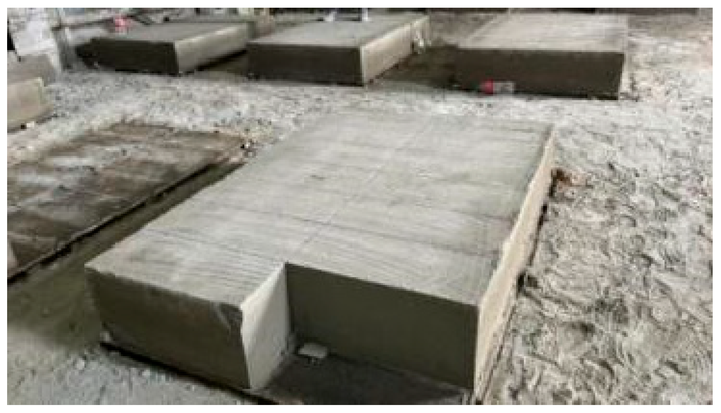 19]. Samples were taken from products made with the AC1, AC2, AC3, and AC4 compositions, measuring 300 × 250 × 600 mm. From these samples, cubes measuring 100 × 100 × 100 mm were cut from the upper, middle, and lower parts of the product. During the compression test, load was applied to the sample at a constant rate of (0.6 ± 0.2) MPa/s until failure occurred.