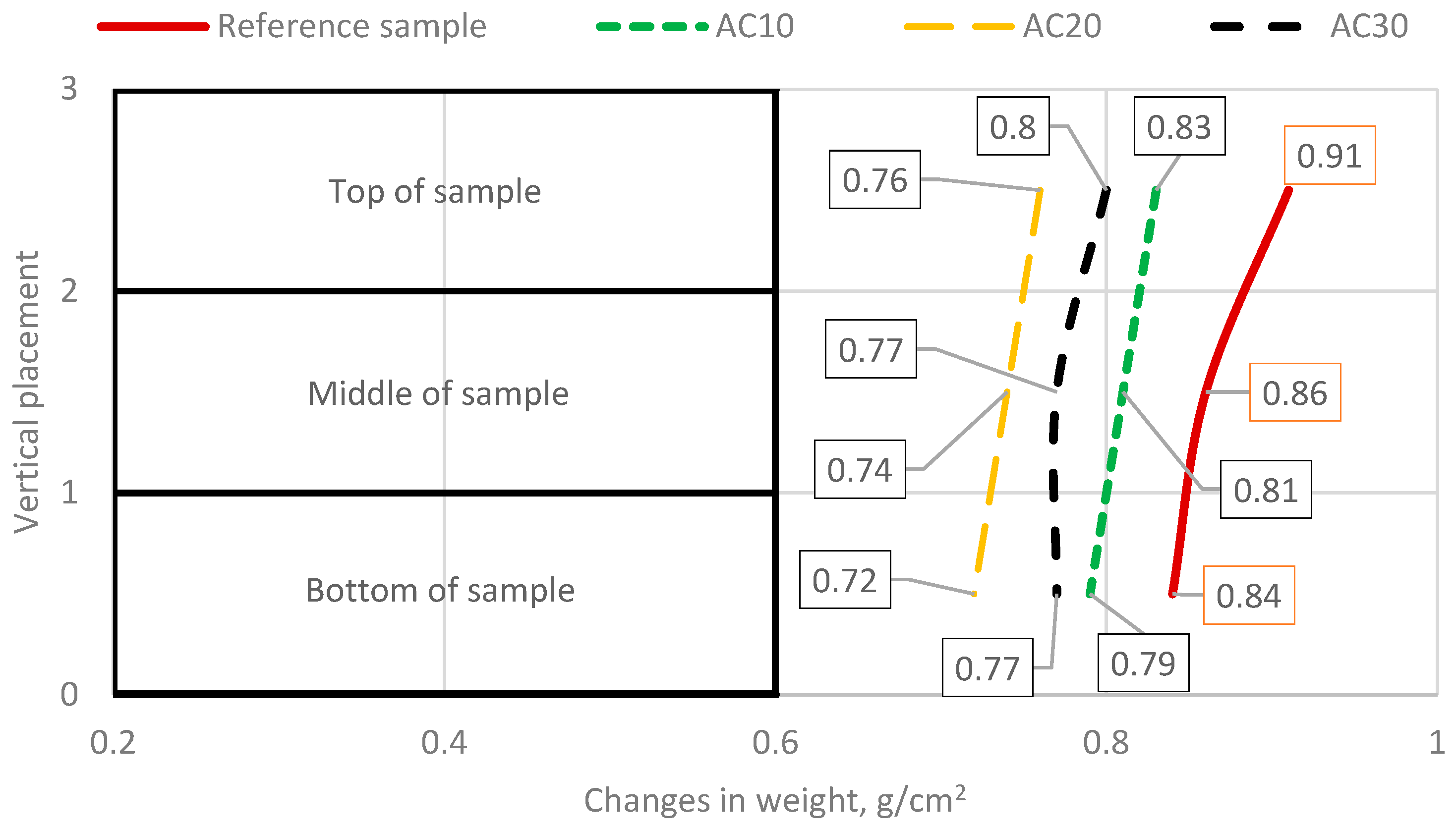 The best wear resistance was observed in the AC20 sample, exceeding that of the RC samples by 15% and that of the AC10 and AC30 samples by 9 and 5%, respectively. No notable differences were observed in the coefficients of variation with respect to the compared specimen types. The coefficients of variation did not exceed 5.8% in any of the test series, which suggests a close relationship, as well as indicating that the results obtained have a high degree of reliability.