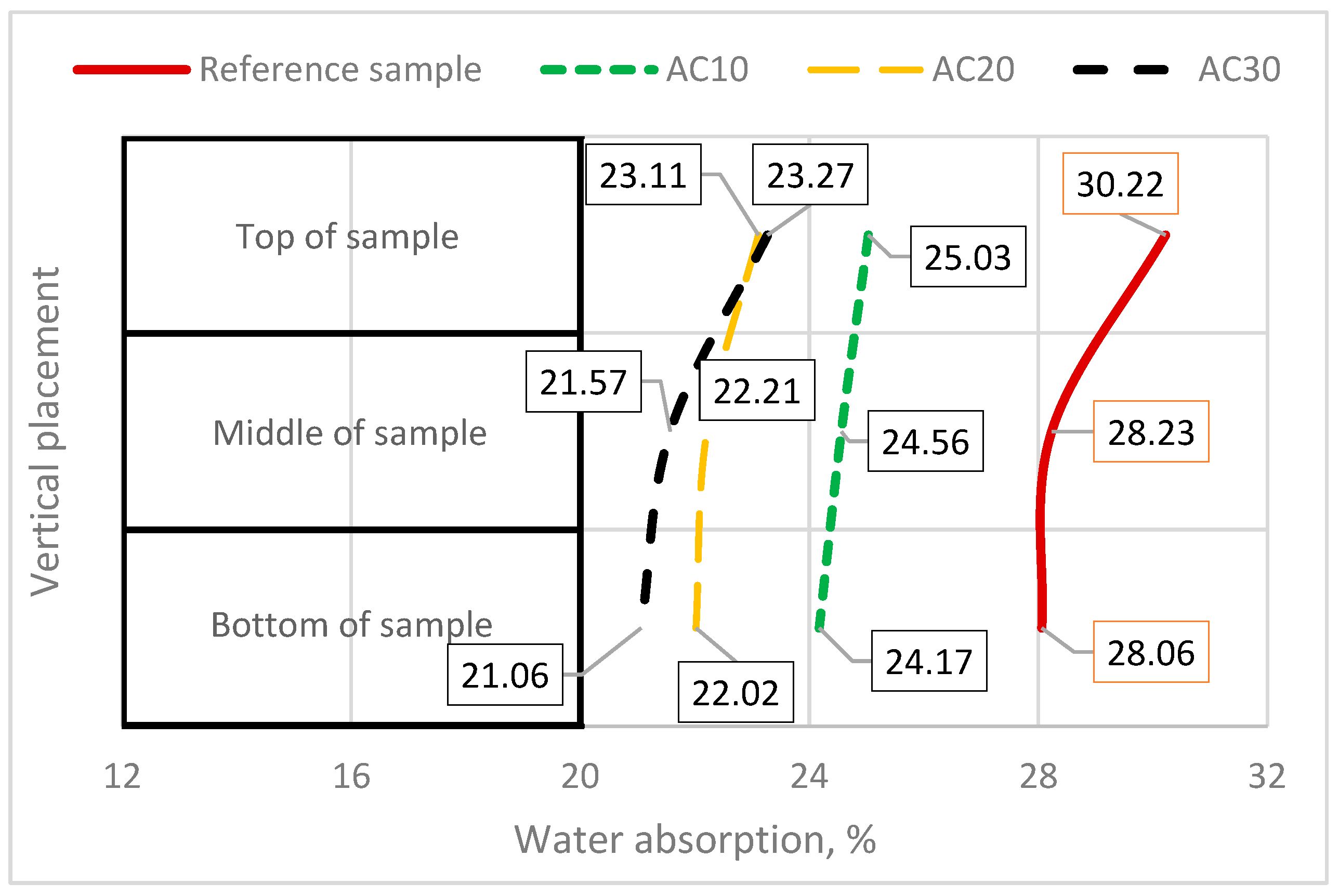 12], where the hydrophobisation effect achieved by adding a plasticising component to the concrete composition led to a 2.1-fold increase in water absorption.