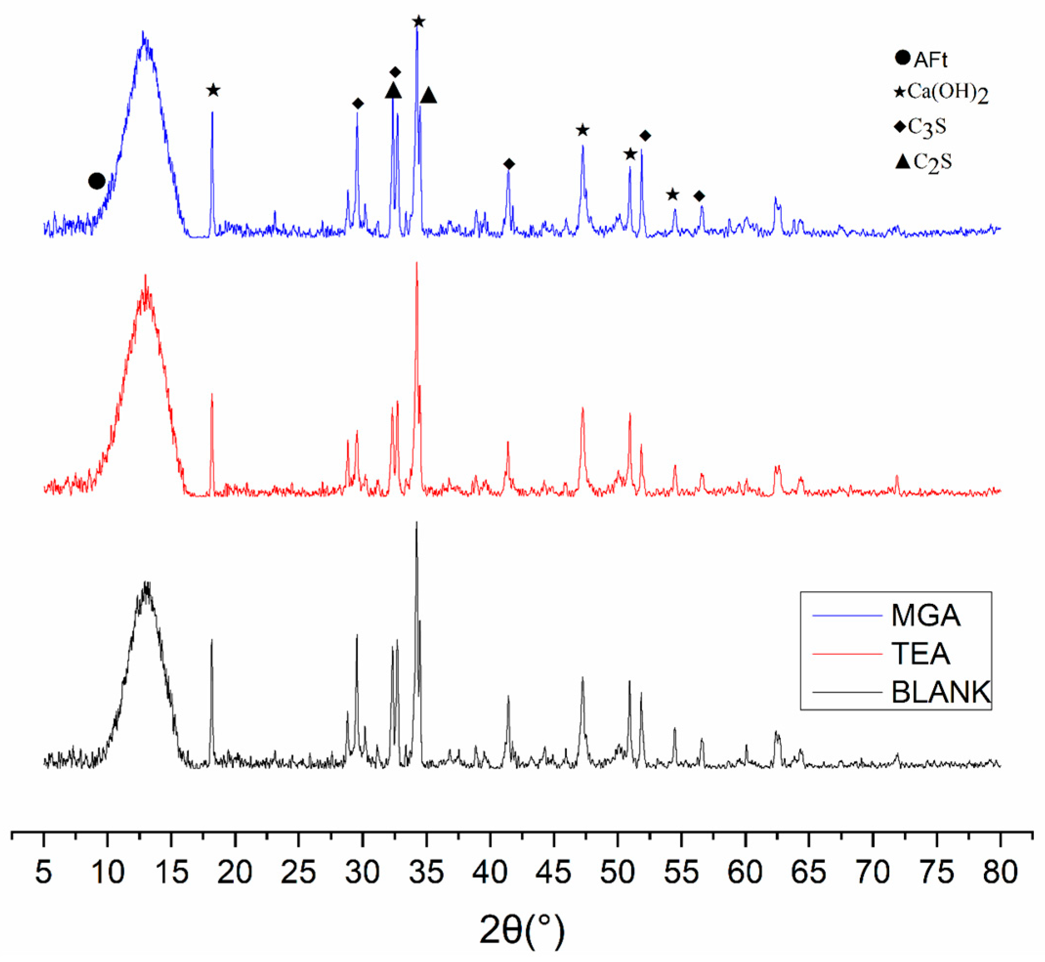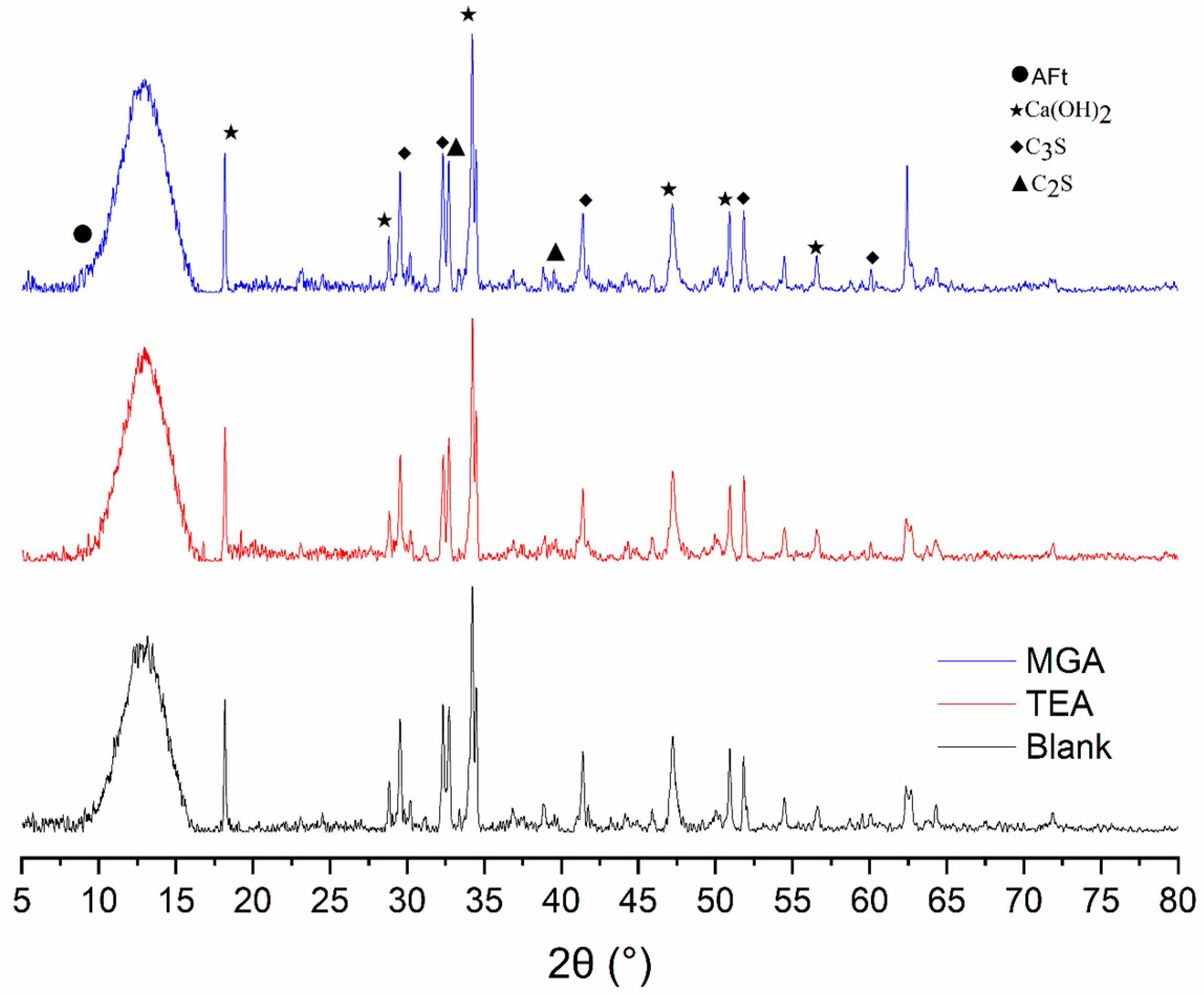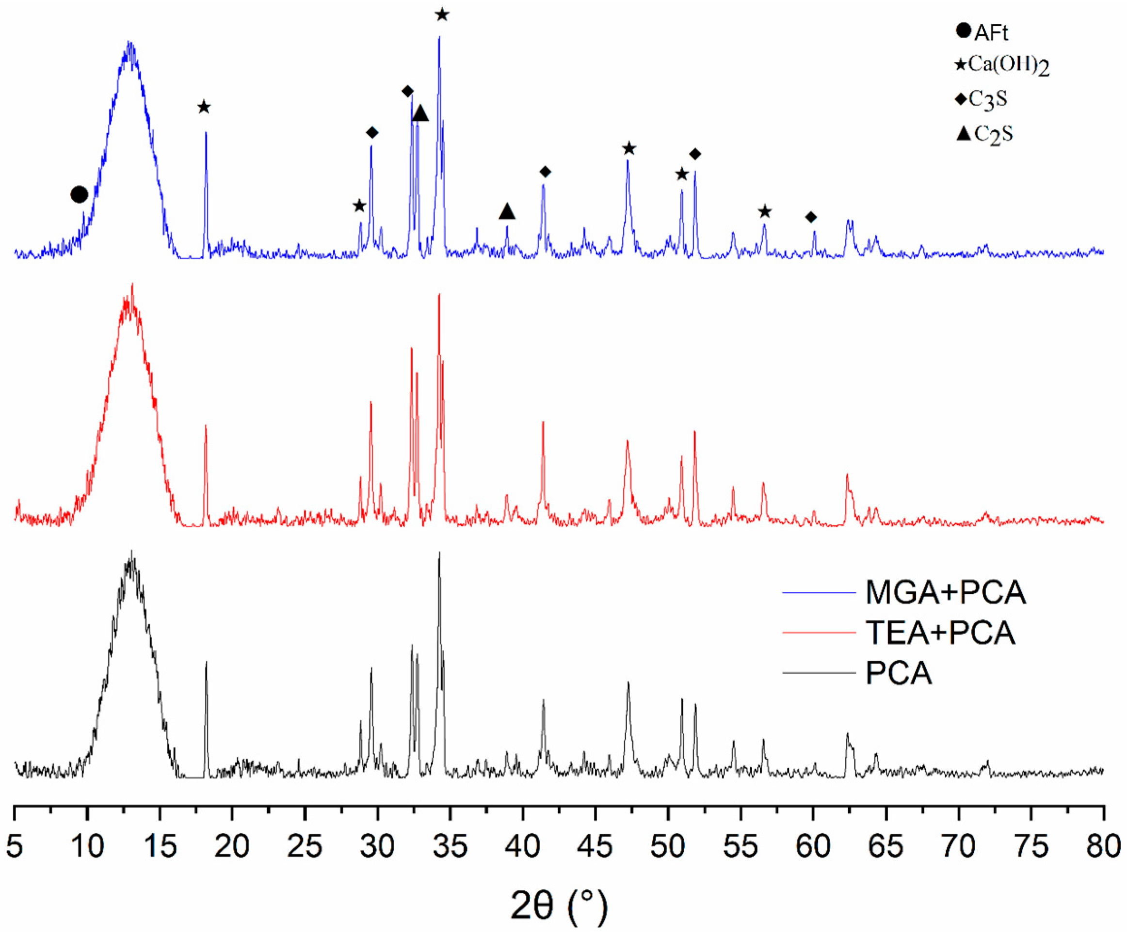 3A without inhibition, further contributing to the refinement of structural integrity. The combined effect of MGA and PCA results in the most defined hydration product peaks in XRD analysis, suggesting enhanced crystallinity and/or quantity of hydration products. This observation, coupled with the measured reduction in setting times (