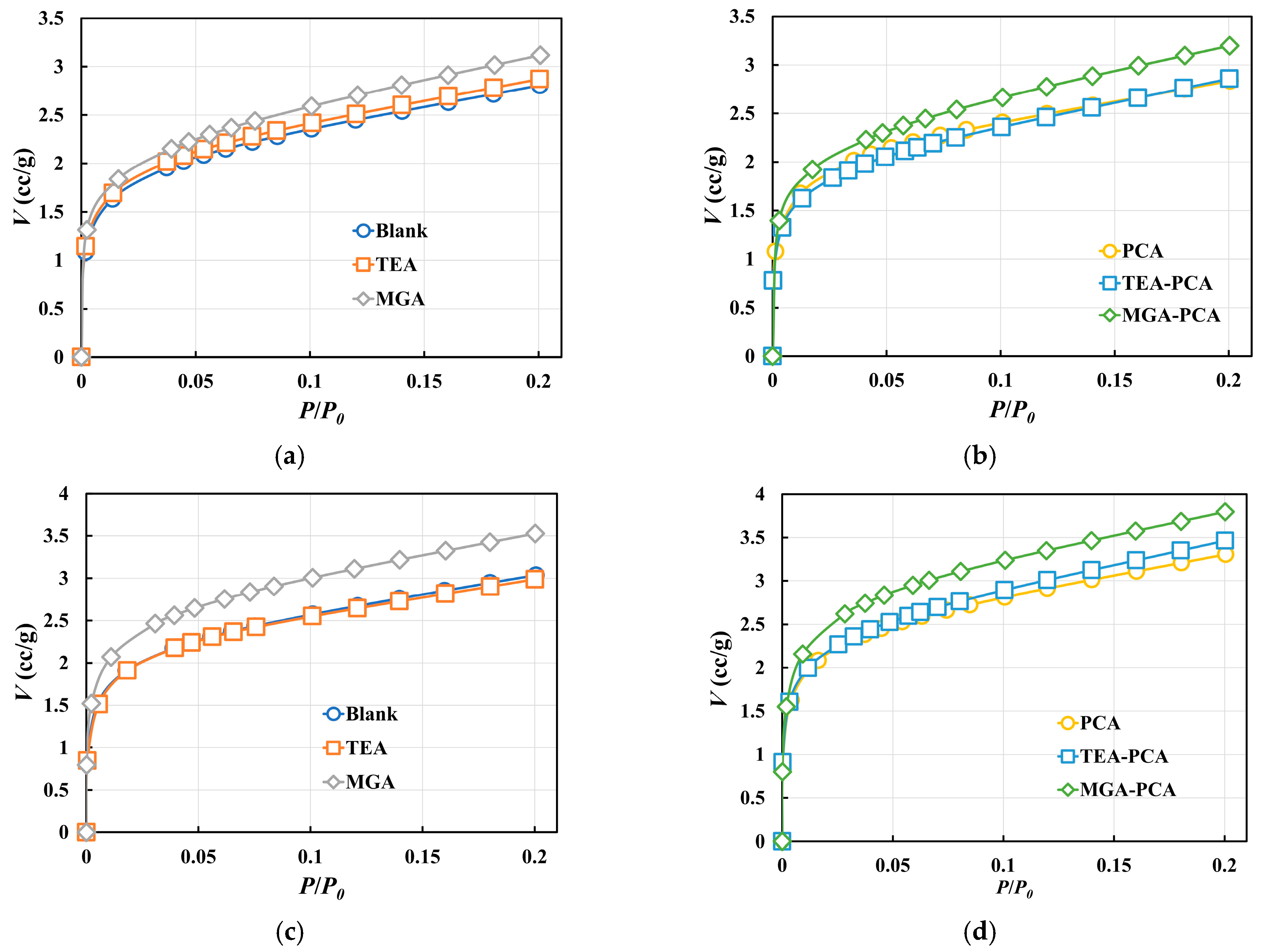 Figure 6a), suggesting a sparsely developed pore structure with weak nitrogen adsorption capacity. In contrast, samples incorporating the grinding aids TEA and MGA showed a significant increase in adsorption volume in the