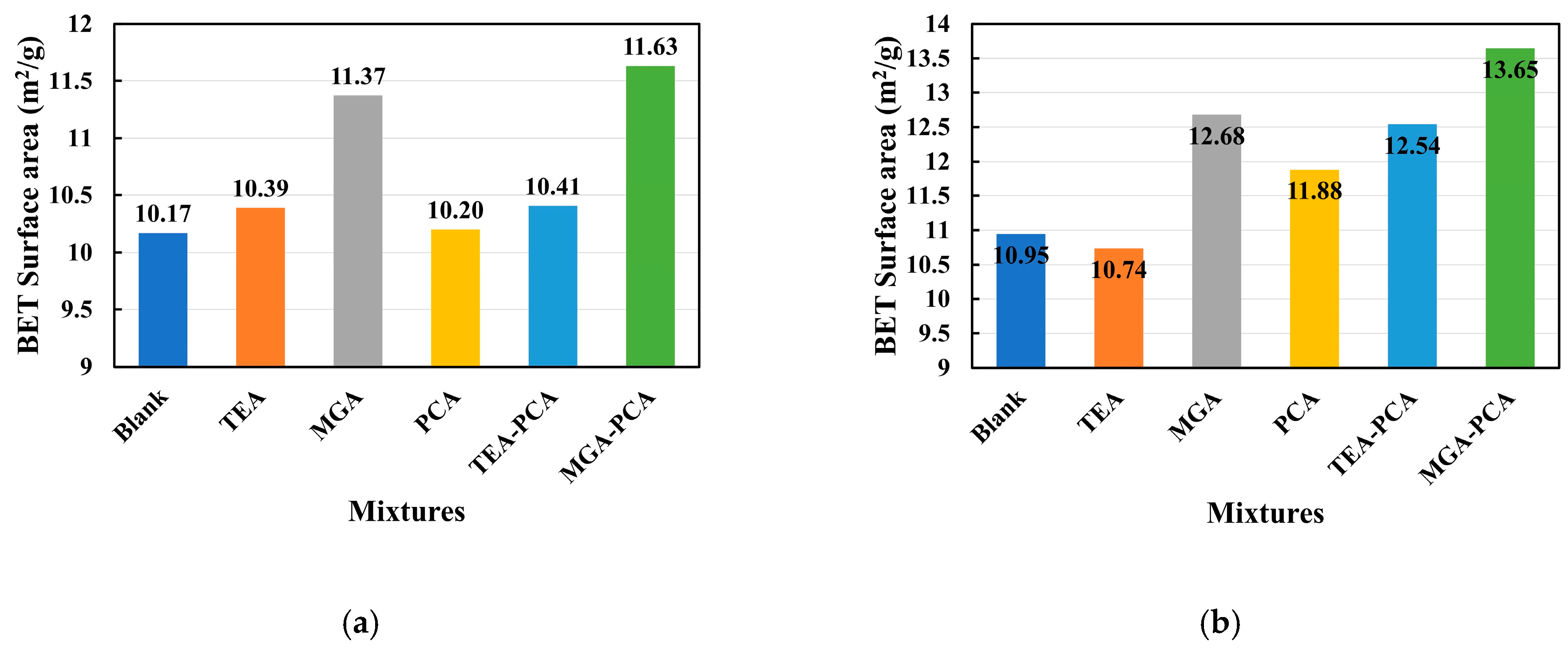 The BET specific surface area tests were conducted on cement pastes incorporating different grinding aids and PCA superplasticizers, with the results presented in