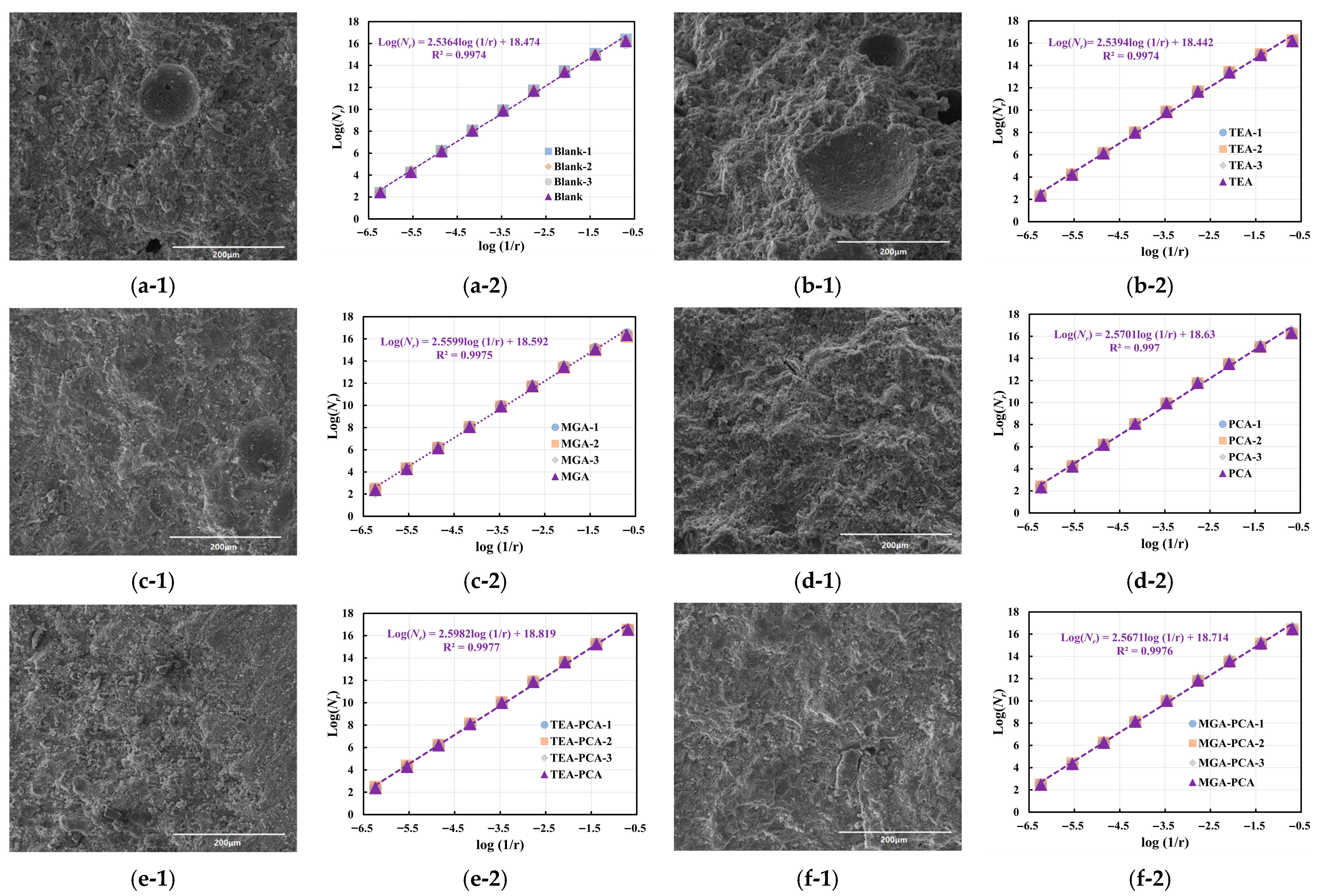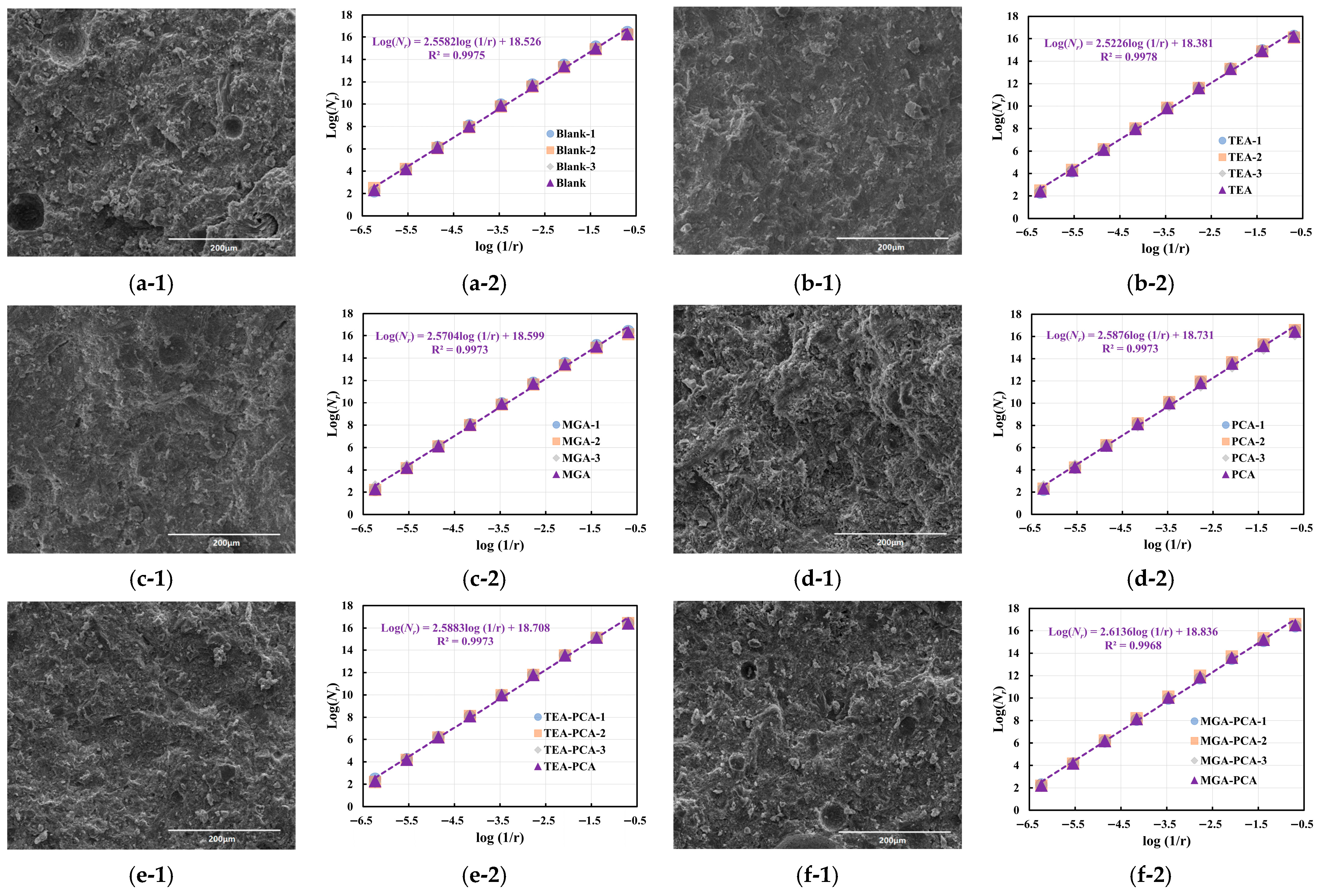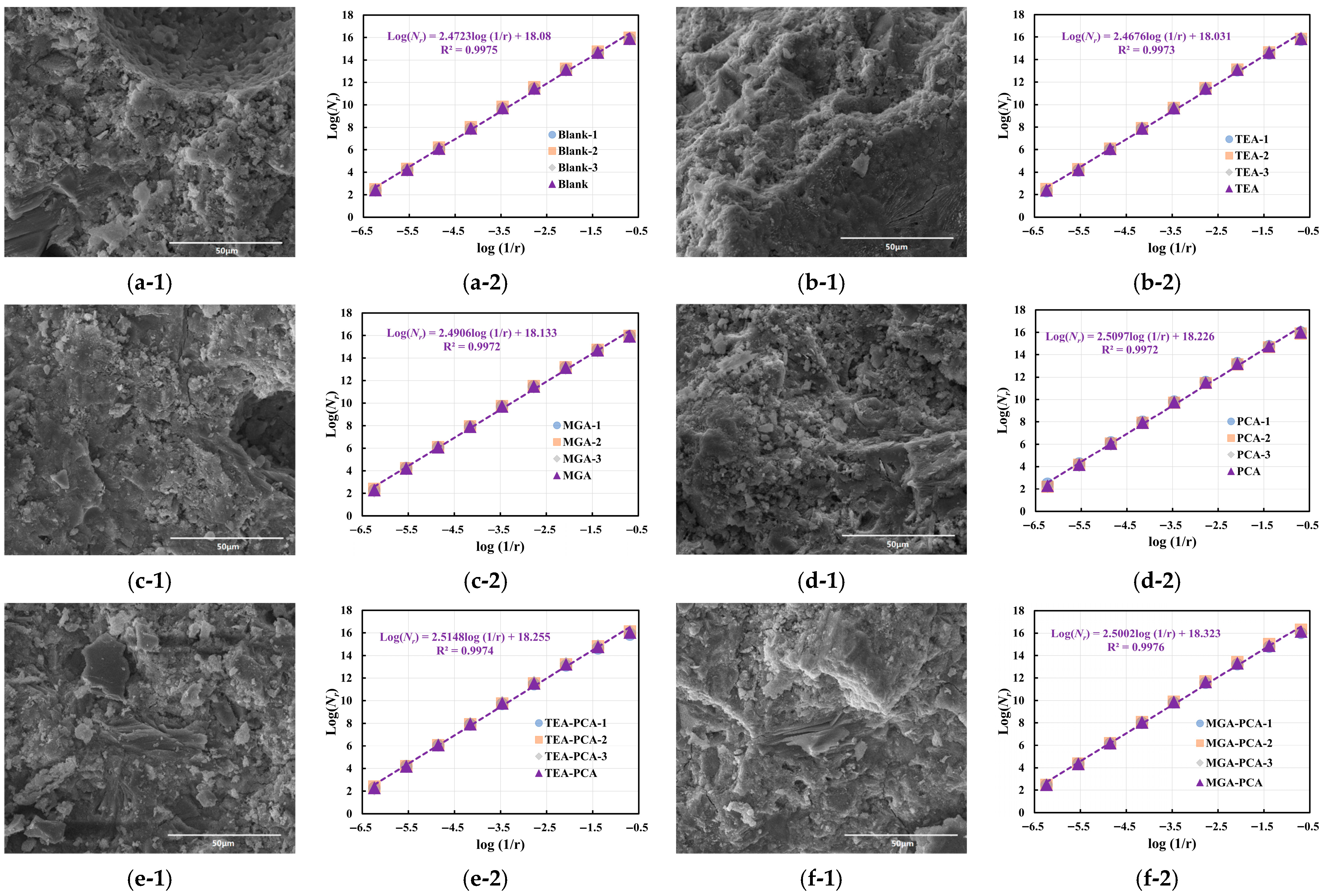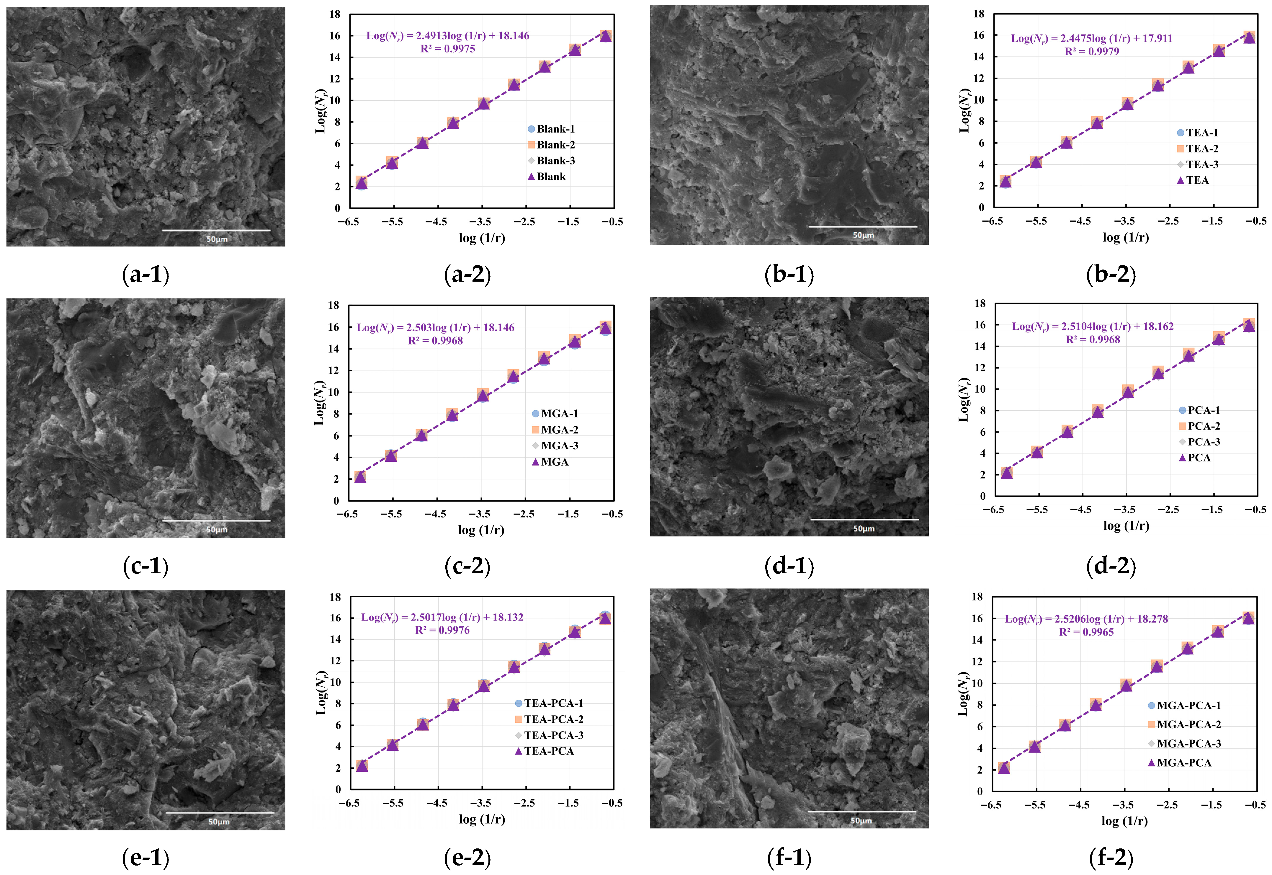 Table 9, the image features exhibit distinct trends. In the Blank group, the grayscale value rises from 77.5 to 88.4, indicating that high-magnification imaging can more precisely reveal the presence of dense regions within the microstructure. However, the fractal dimension decreases to 2.472, with the standard deviation dropping to 0.002, suggesting that structural boundaries in high-magnification images tend toward regularity, with diminished hierarchical perception and enhanced local structural homogeneity. The TEA and MGA samples display similar trends, with grayscale values of 83.3 and 90.6, respectively, and fractal dimensions of 2.468 and 2.491—both lower than their corresponding values at 500×. This implies that under high-resolution conditions, the observed structural units are more refined but exhibit relatively converged complexity.