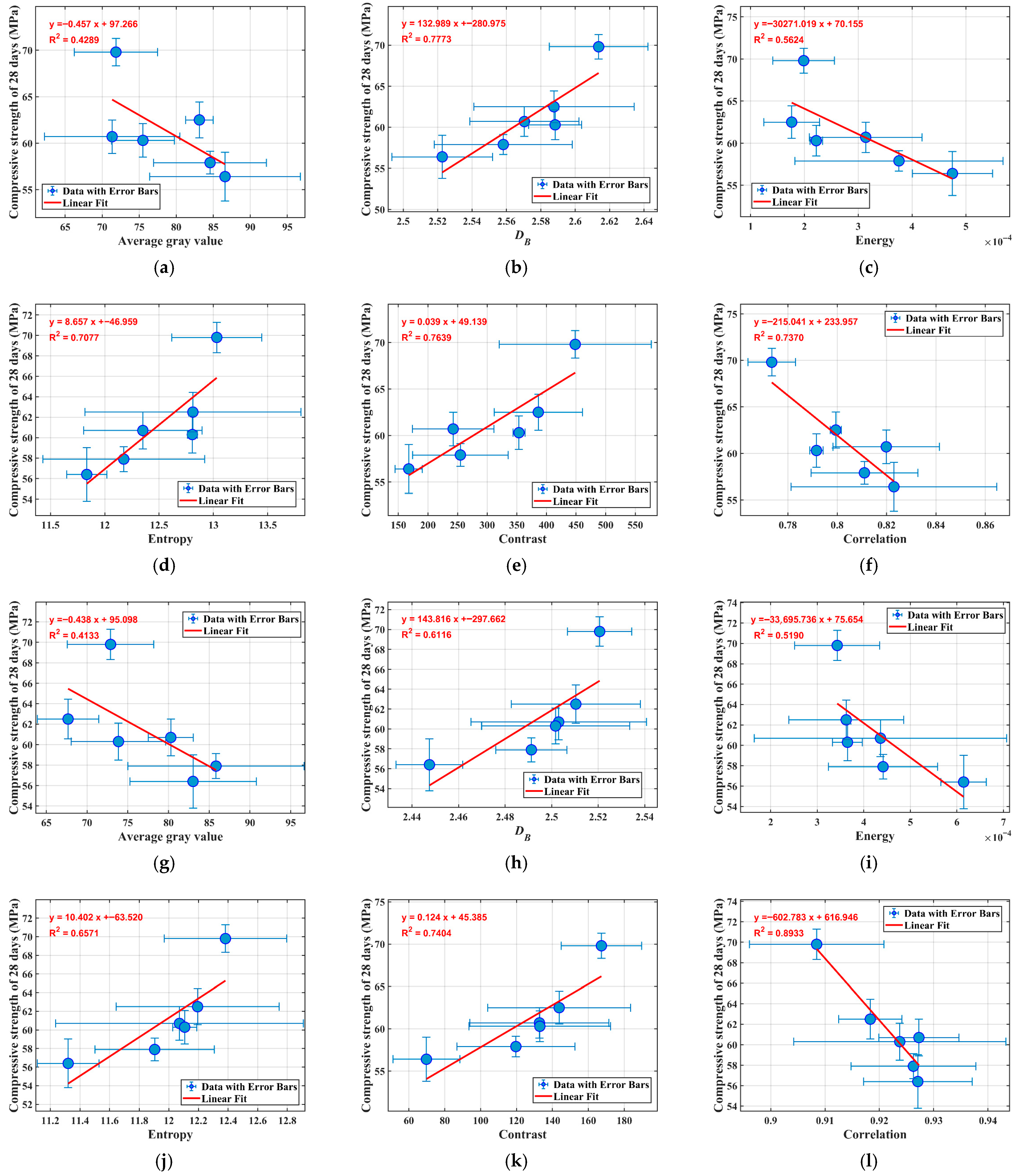 Figure 16a,g, the correlation between average gray value and compressive strength exhibits considerable fluctuation across curing ages. At 7 days, a positive correlation is observed, suggesting that higher gray values (indicative of denser early-age microstructures) align with improved strength development during initial hydration phases. At 28 days, the relationship between average grayscale value and compressive strength shifts to a negative correlation in some cases, with overall R