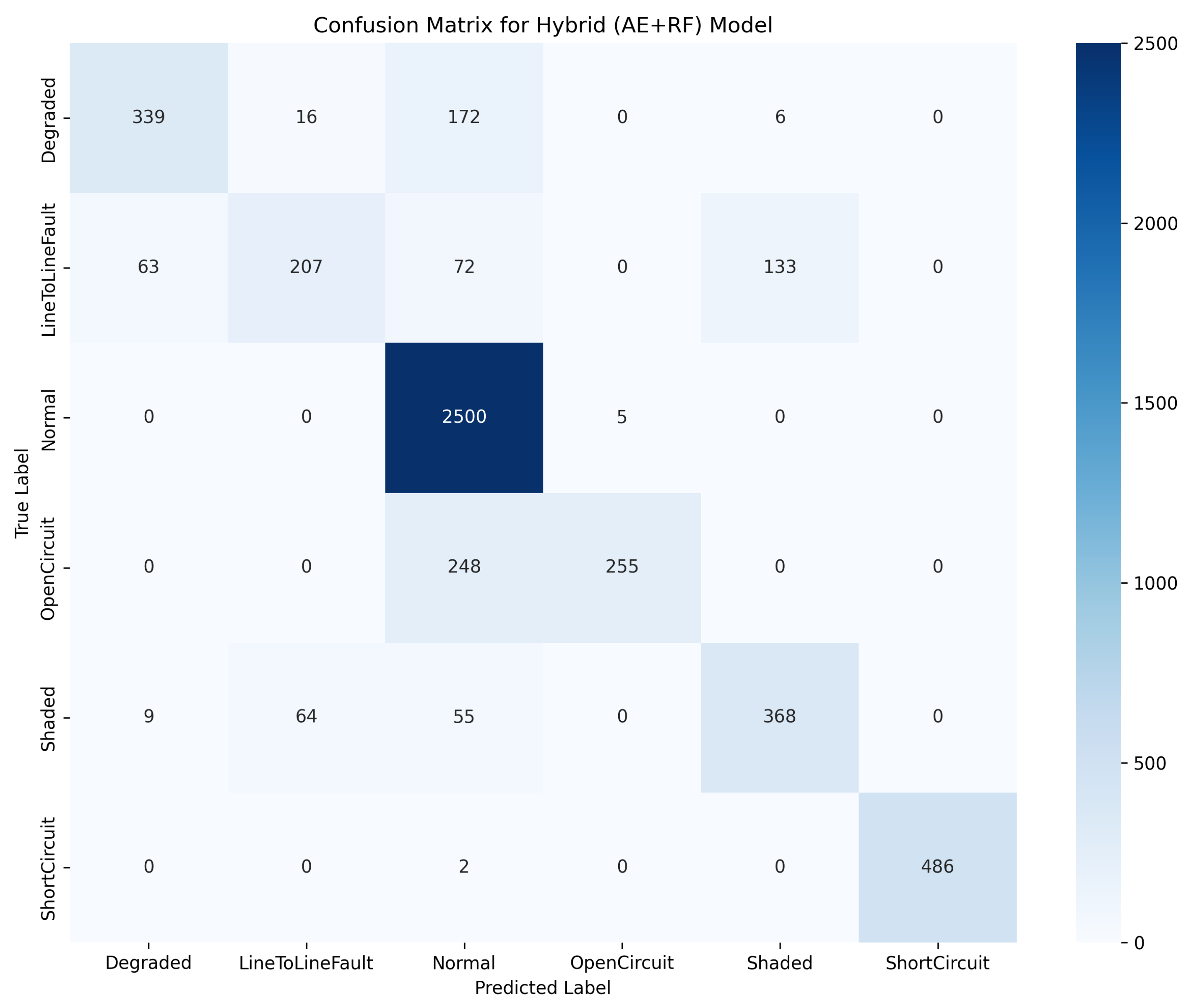 The difference in performance occurs in the more subtle classes. The baseline model appears to be better for ‘Degraded’, ‘Normal’, and ‘Shaded’ faults precisely because, as a single-stage classifier, it is forced to make a decision for each case. The hybrid model’s poorer F1-scores for these classes are not the blame of its RF classifier; this is a direct and understandable result of the failure of the Stage 1 autoencoder to flag these events as anomalous in the first place. In an ideal hybrid system, the F1-scores would be equal to or greater than the baseline for every category, which would imply an ideal autoencoder. The outcome that is witnessed, however, highlights the essential engineering trade-off: the design consciously sacrifices sensitivity to low-priority, unclear faults in exchange for the high-confidence diagnosis and strength of its two-stage procedure.