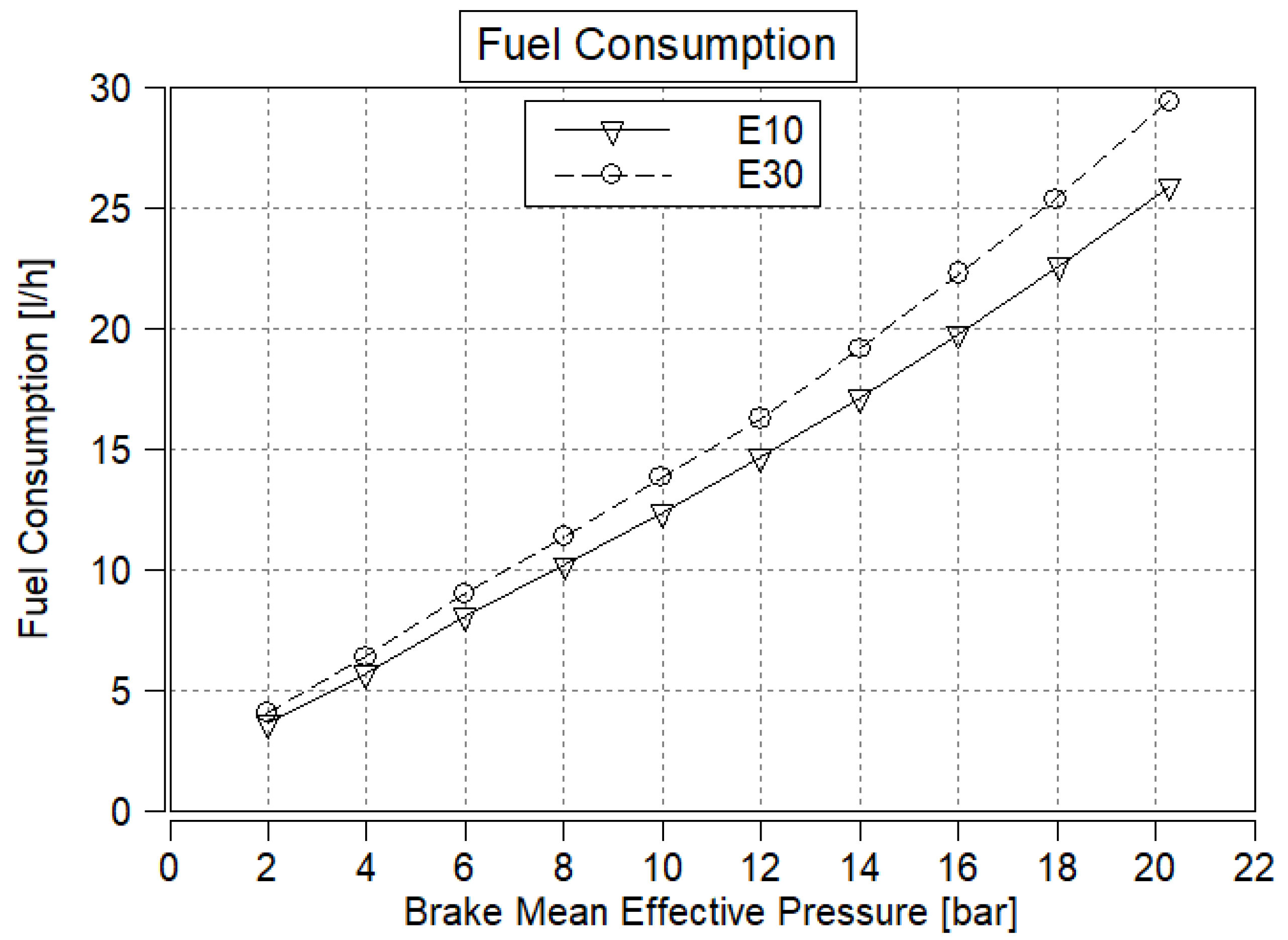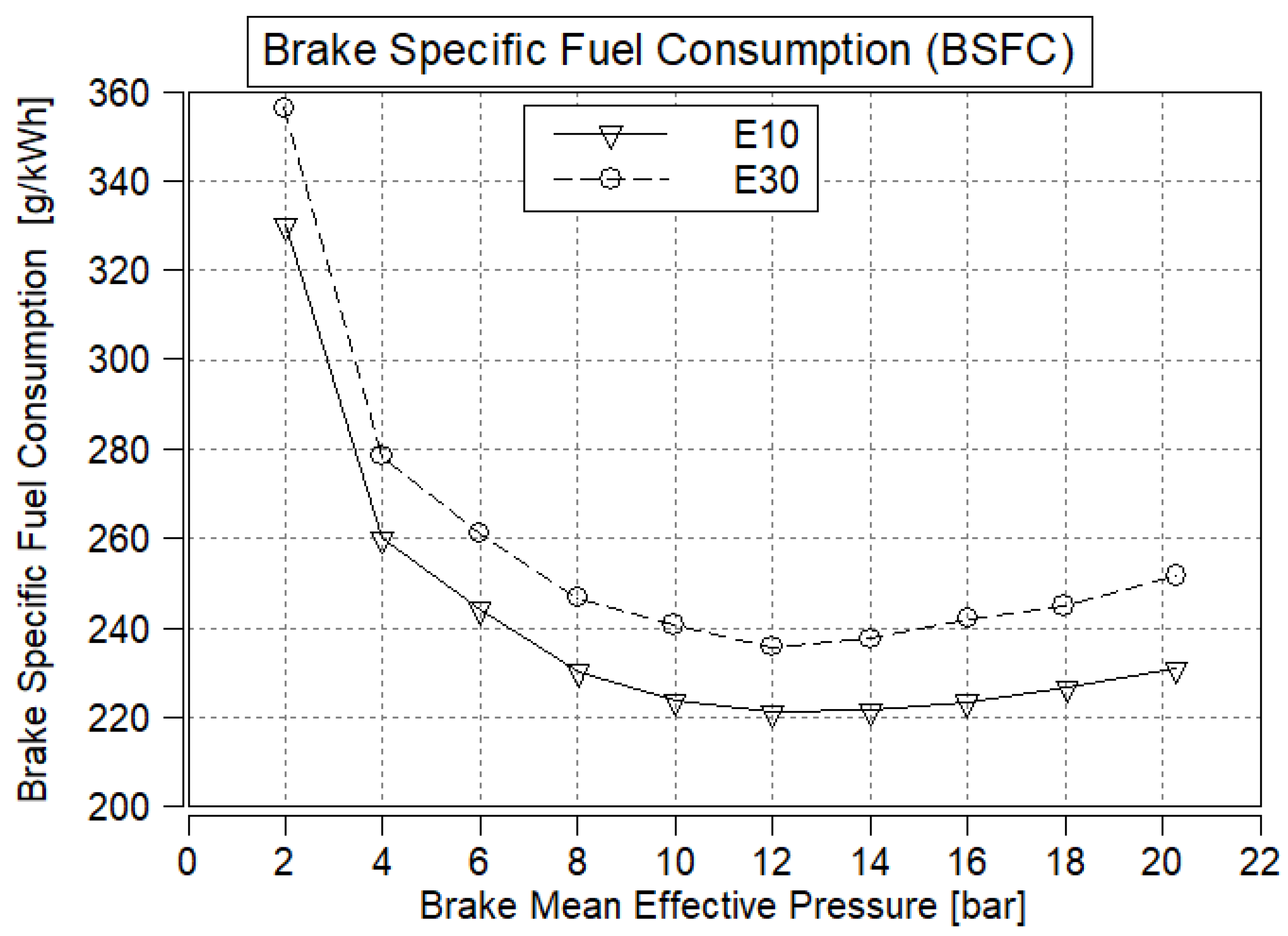 - BSFC of E30 is anticipated to increase due to its reduced lower heating value (LHV) compared to E10.