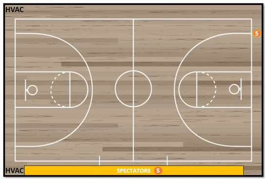 In particular, two Siba PM devices were installed in April 2022 at key indoor locations (Figure 1) within the municipal athletic facility: (1) above the spectator stands in the central basketball court and (2) near the referees’ entrance. Each unit was mounted approximately 2 m above the ground in zones free of interference from court activity. Power and Ethernet connections supported uninterrupted data transmission. Due to a hardware malfunction, the sensor at the referee entrance was initially excluded from analysis until it had been repaired and replaced. As a result, only a subset of its data have been included in the analysis.