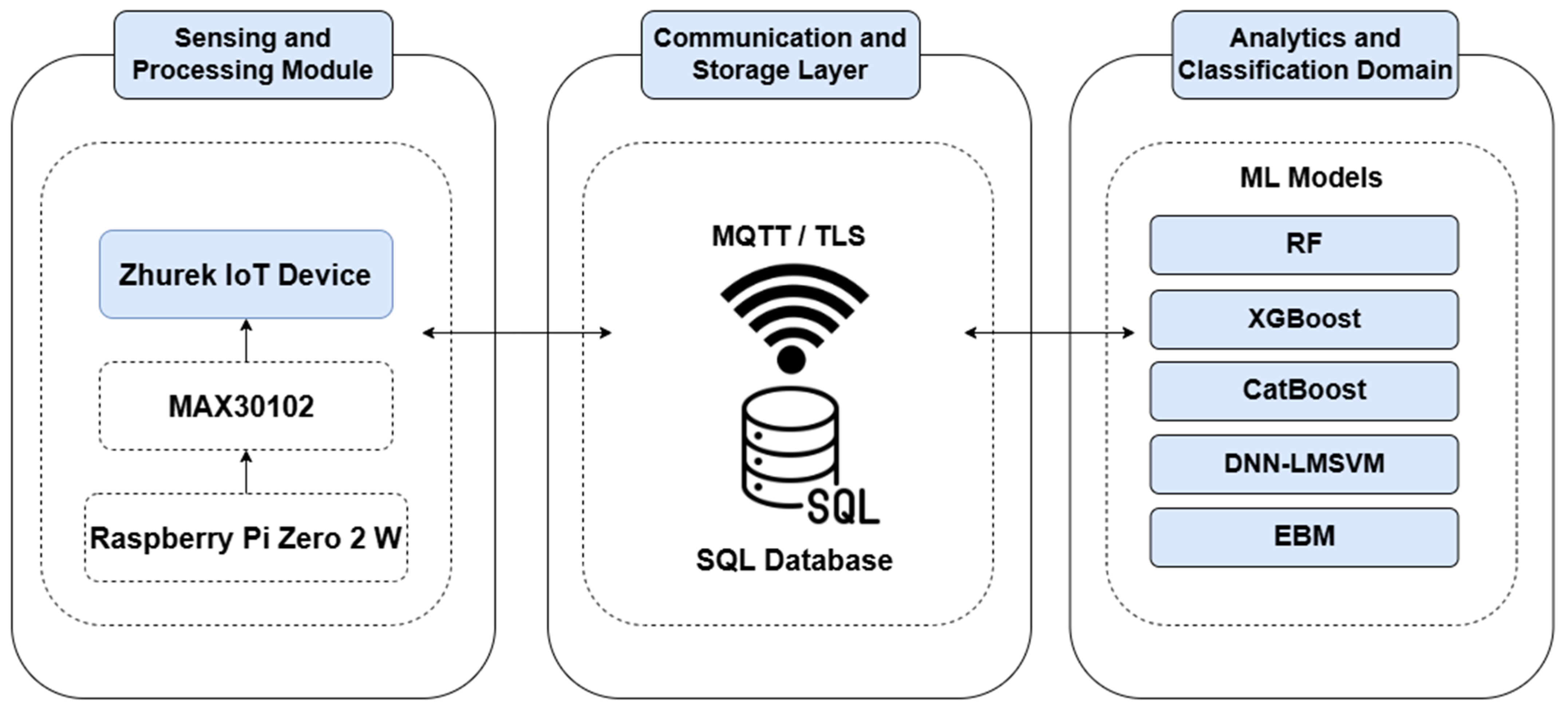 At the analytics and classification domain, the extracted HRV features are utilized to predict the risk of autonomic dysfunction associated with IHD. The stored data is periodically processed using various ML algorithms, including gradient boosting methods (XGBoost, CatBoost), RF, interpretable generalized additive models (EBMs), and hybrid architectures combining deep neural networks (DNNs) with least-mean-square support vector machines (LMSVMs). These models are trained on labeled datasets to classify patients by risk level and to detect early patterns of dysfunction. This approach enables automated preliminary diagnostics and supports wellness assessment and risk stratification in remote monitoring scenarios.