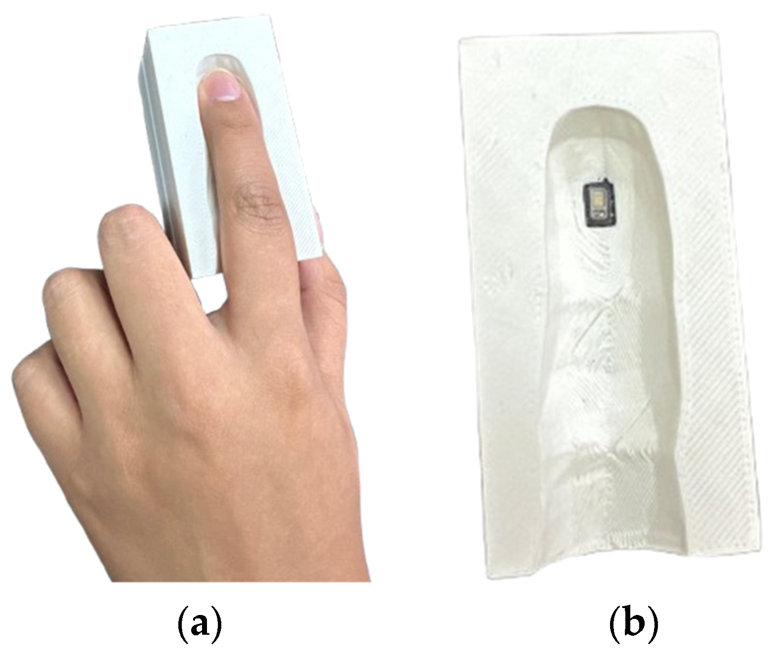 The Zhurek device integrates MAX30102 optical sensor (DFRobot Gravity: SEN0344, DFRobot, Shanghai, China) with a Raspberry Pi Zero 2 W microcontroller (ARM Cortex-A53, 1 GHz, 512 MB RAM, Raspberry Pi Ltd., Cambridge, UK) running Raspberry Pi OS Lite (64-bit, Version 6.12, Raspberry Pi Foundation, Cambridge, UK). Only the infrared channel is used for signal acquisition, sampled at 100 Hz over a hardware I2C bus (address 0 × 57). The sensor is enclosed in a 3D-printed PLA shell with an IR-shielded finger clip and soft elastomer padding to reduce motion artefacts and ambient interference.
