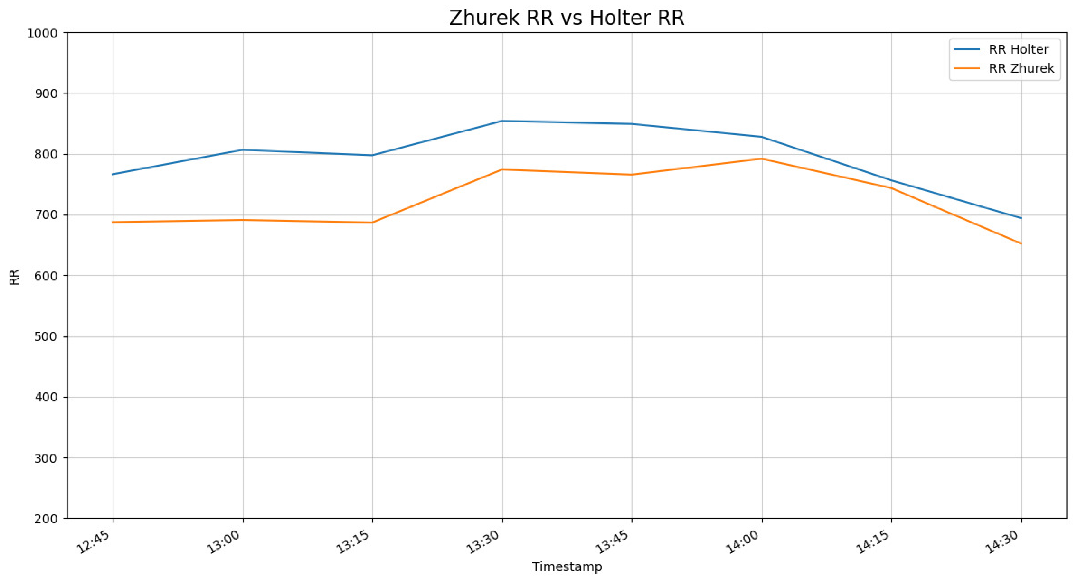 The data reveals a strong temporal correlation, confirming that the Zhurek device accurately captures the dynamic fluctuations of cardiac rhythm. A minor, stable offset in the absolute values was observed, which characterizes the inherent difference between the PPG and ECG measurement techniques. Given that the primary goal of HRV analysis is to assess the variability in rhythm rather than absolute values, this high degree of trend alignment validates the Zhurek device as a reliable tool for its intended application.