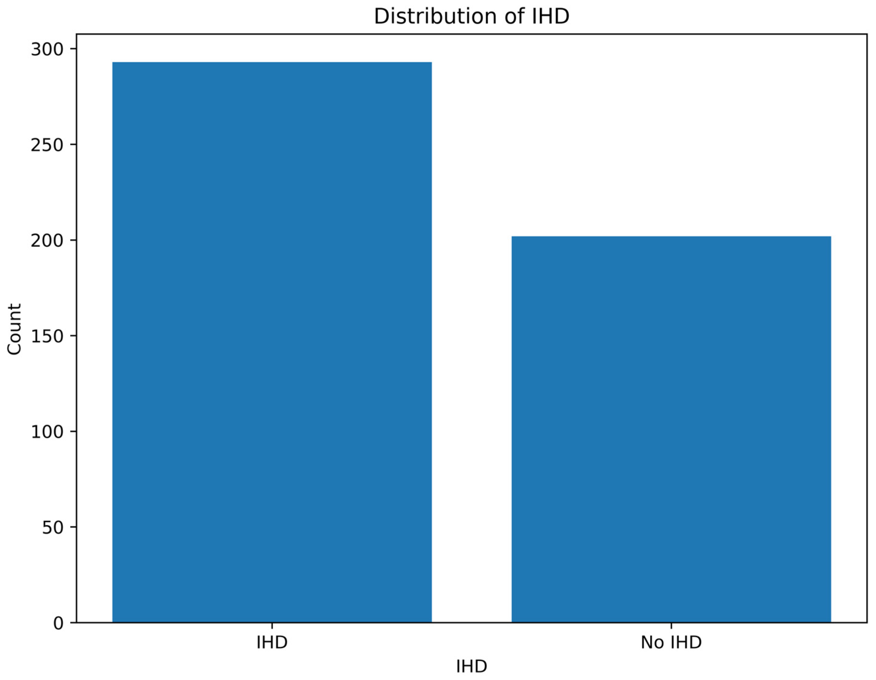 To assess the outcome of class balancing, a class distribution plot was created after applying CTGAN, showing the number of records classified as having IHD and those without it (No IHD).