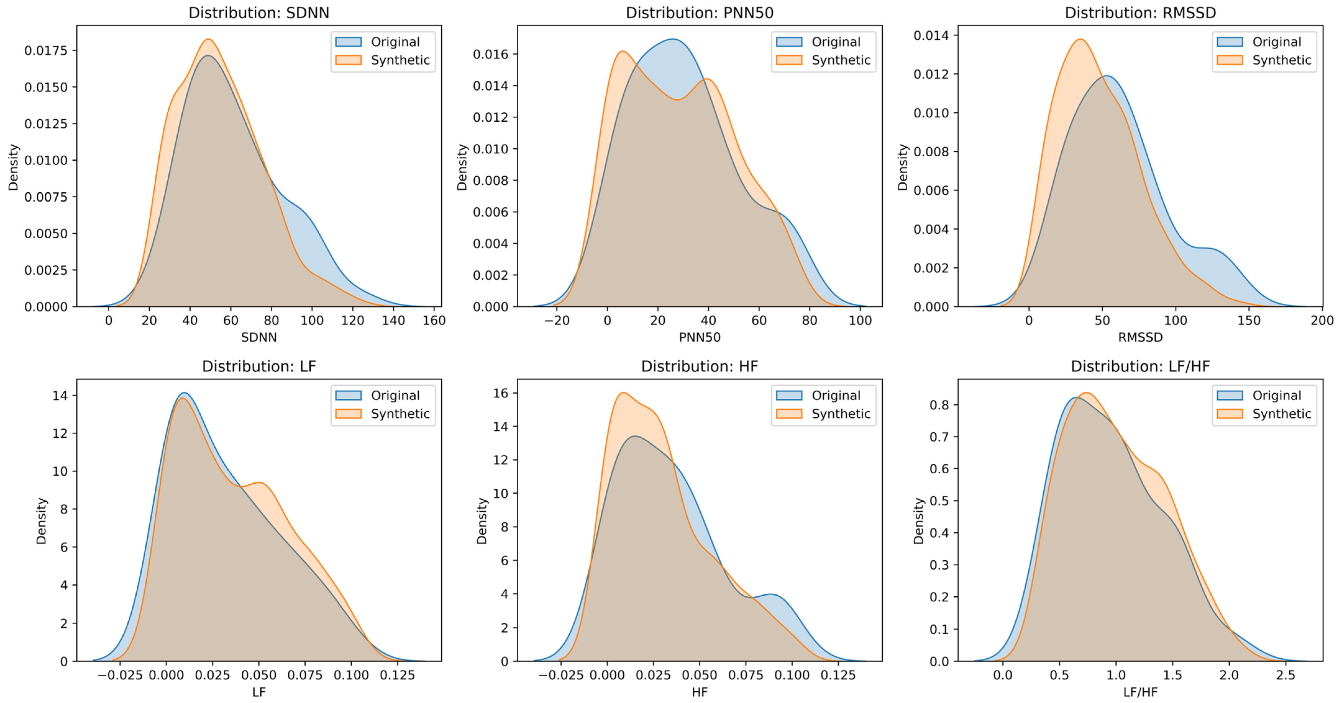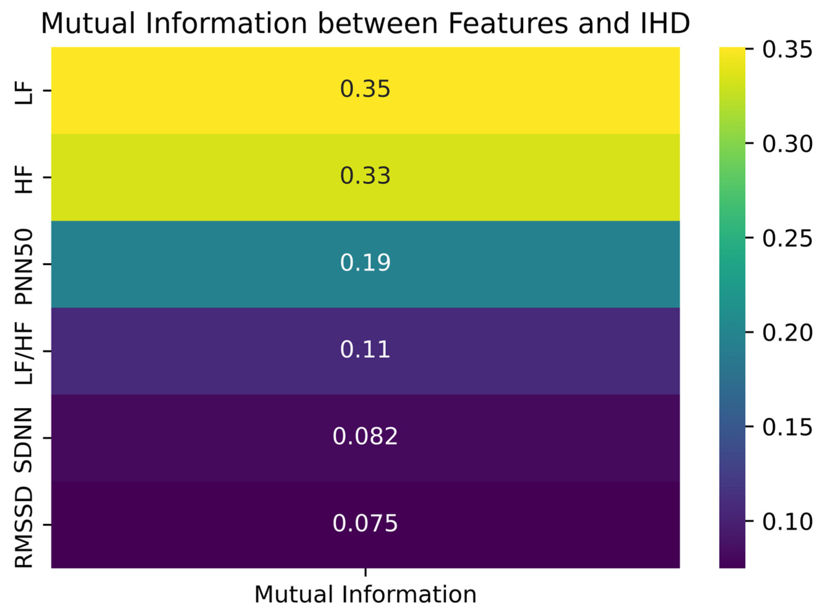 The mutual information analysis revealed that frequency-domain features, particularly LF and HF, were more strongly associated with IHD. To overcome the imbalance in class distribution, particularly due to the small number of healthy control participants, we employed CTGAN to generate synthetic HRV data. While synthetic data cannot fully replicate the complexity of physiological signals, it can approximate their statistical structure and support more balanced learning during model development.