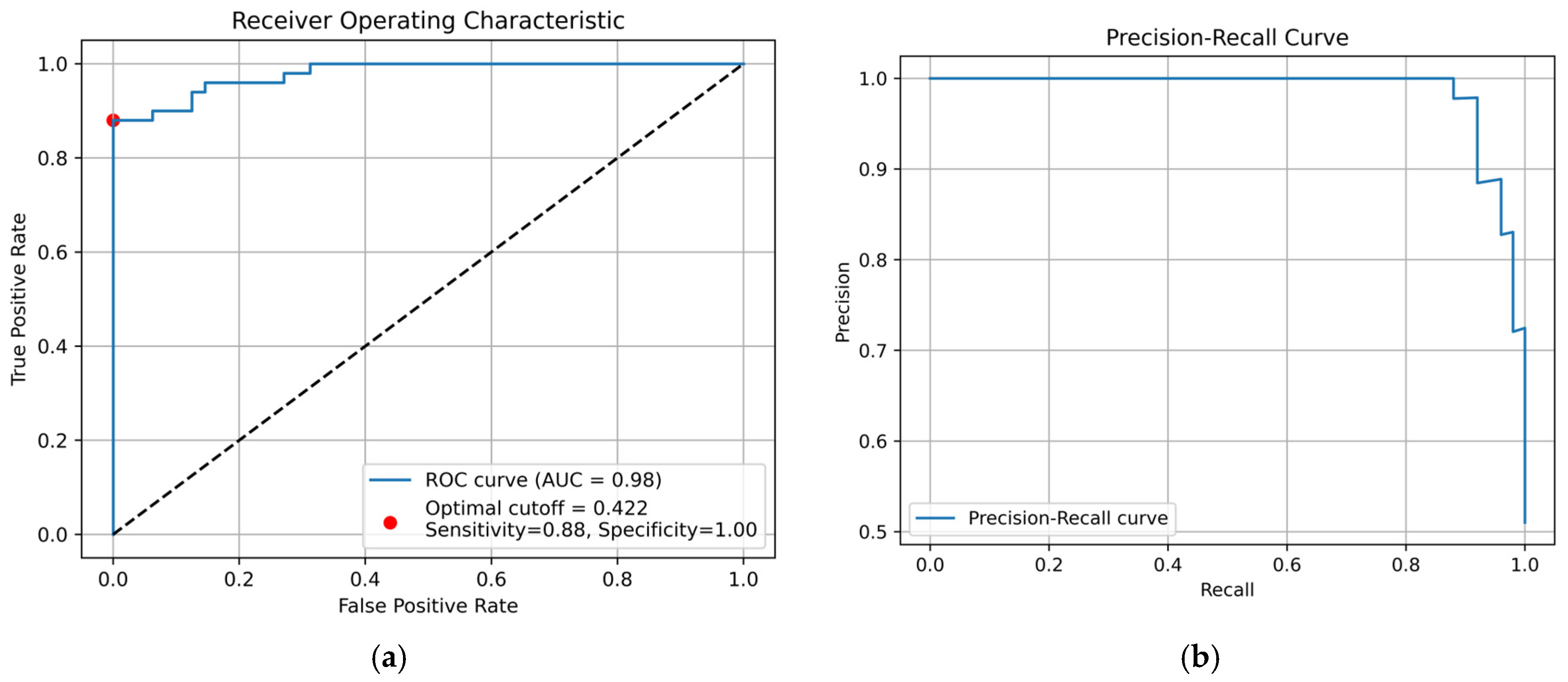 The ML classification results further demonstrate that a custom, low-cost PPG system can classify IHD with high performance (AUC = 0.98) and strong signal fidelity. Specifically, it achieved a low absolute deviation of −4.8 ms for RMSSD and +33.1 ms for SDNN against a Holter ECG. This performance is particularly noteworthy when compared to prior validations, such as the 24 h wrist-recording study in [
