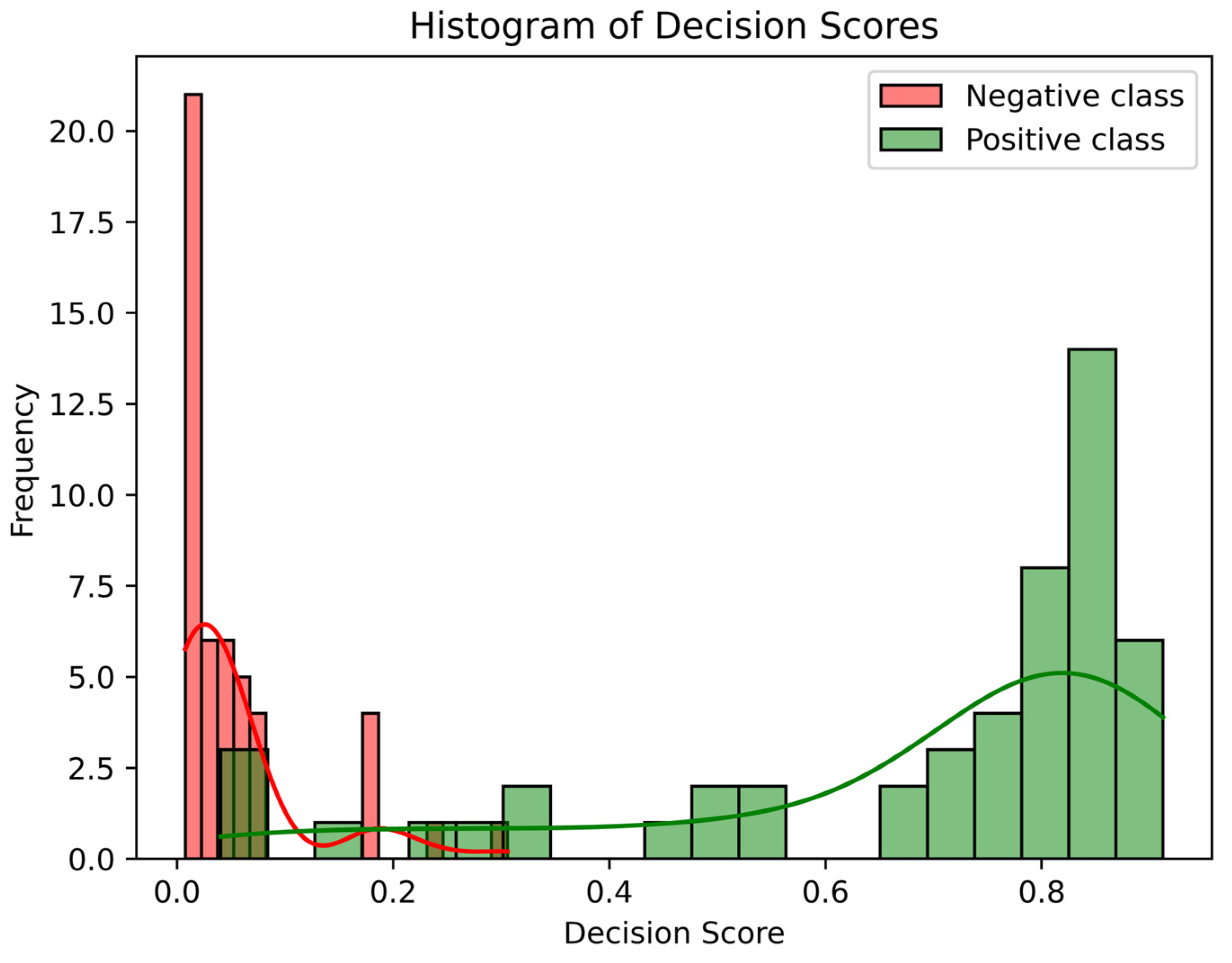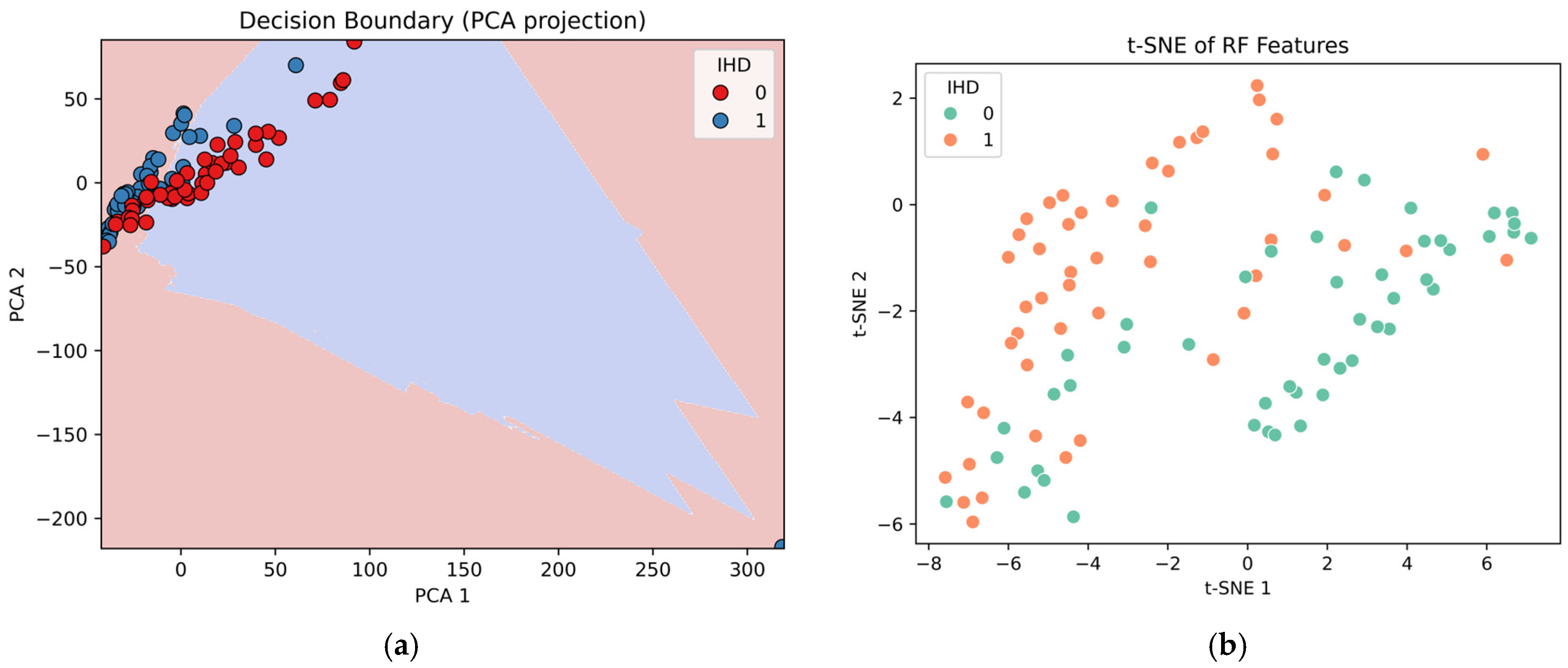 20]. Applied to our dataset, this analysis demonstrated that frequency-domain HRV features (LF and HF) exhibit the strongest dependency on the target variable, suggesting they carry the most relevant physiological signals associated with autonomic imbalance in IHD. Evaluation metrics, including the ROC and precision–recall curves, confirmed the reliability of the classifiers. The high area under the ROC curve (AUC = 0.98) reflects strong sensitivity and specificity, while the histogram of decision scores provides a visual representation of the model’s discriminative ability. The negative class distribution is highly skewed, with a strong peak near a decision score of 0.0, indicating that the model confidently assigns low scores to the majority of samples from this class. Conversely, the positive class distribution is broader, with a noticeable concentration of scores in the high range (0.8–0.9), reflecting the model’s ability to identify a large subset of positive samples with high confidence. However, the histogram also reveals a region of overlap between the two class distributions. This overlap indicates that for a portion of the samples, the model’s predictive certainty is diminished, as both negative and positive class data points occupy this same range. This observation underscores the importance of considering the decision score itself, beyond a simple binary classification, especially for clinical decision support where borderline cases may require further scrutiny. Visualizations using PCA and t-SNE further illustrate the separability between classes. Although some overlap exists—as is typical in biological data—the overall clustering supports the discriminative power of HRV features. These projections also help to interpret the feature space learned by the model and highlight regions of higher classification uncertainty.