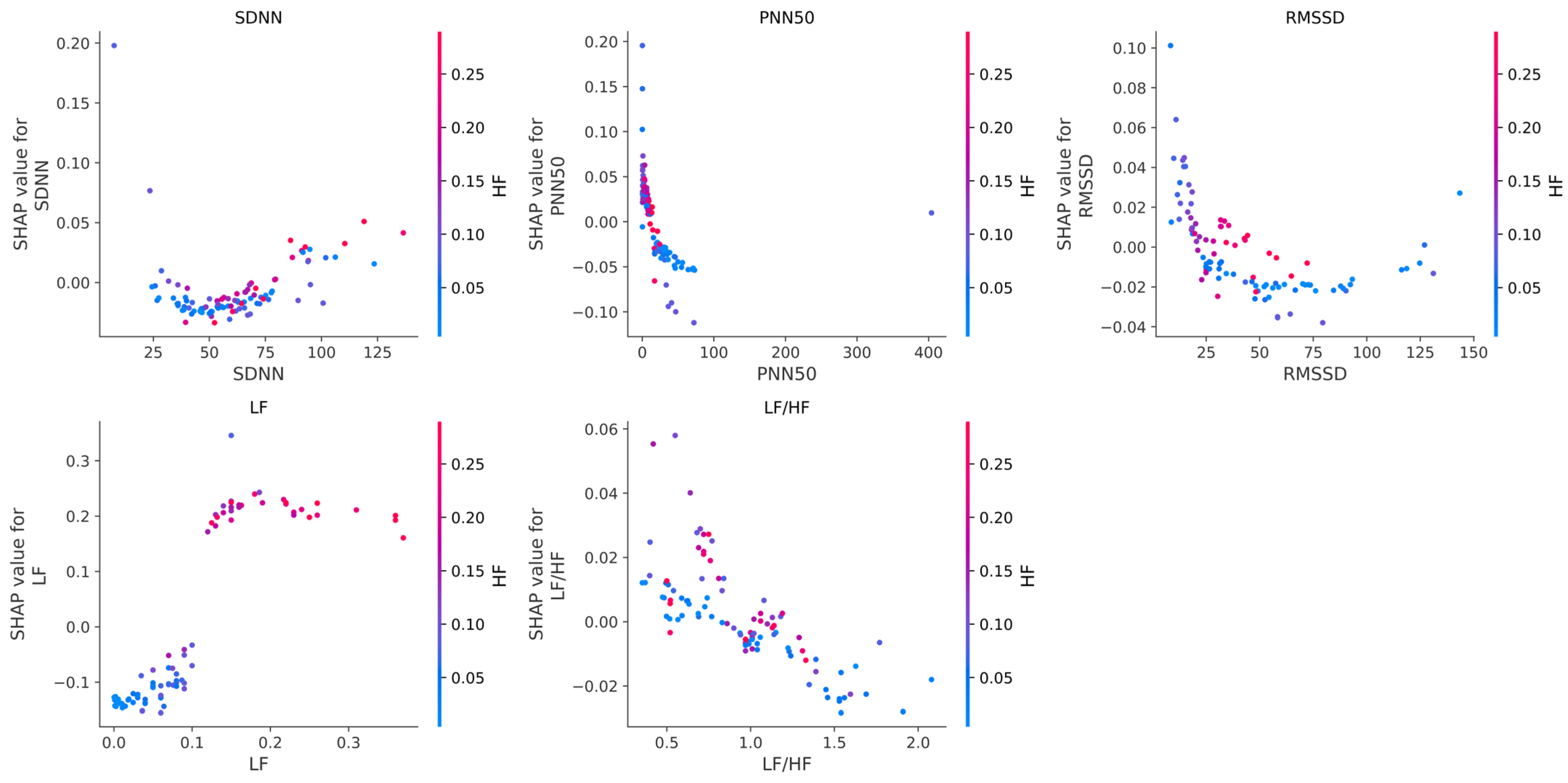 The SHAP analysis revealed that frequency domain features, particularly HF and LF, play a central role in distinguishing between IHD and non-IHD cases. These findings are consistent with physiological evidence linking reduced autonomic function, especially diminished parasympathetic activity, with cardiovascular risk [