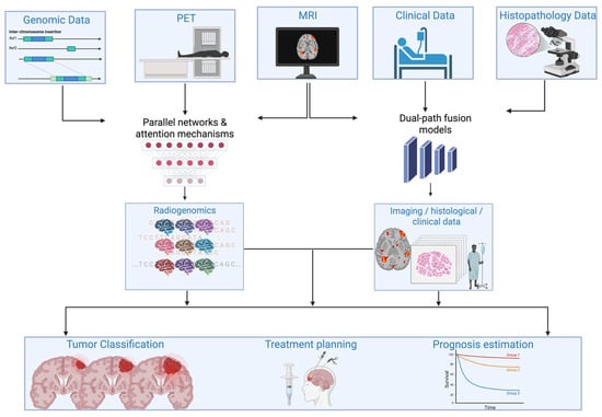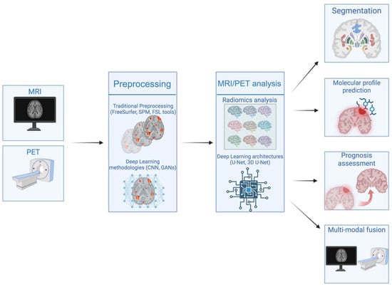 MRI or PET imaging as input data, undergoing traditional or deep learning-based preprocessing. In this figure it is highlighted how radiomics and deep learning architectures are used for tumor segmentation, prognosis assessment, and molecular profile prediction. The pipeline supports multi-modal data fusion, enabling comprehensive glioma characterization.