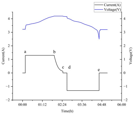 The a–b section in Figure 1 corresponds to the constant-current charging phase. During this stage, the charging current is maintained at a constant level, while the voltage progressively increases with the charging time until it reaches the predetermined upper voltage limit, which enables the rapid charging of the battery. The b–c section represents the constant-voltage charging stage. Once the battery voltage reaches the preset upper limit, the system automatically transitions to the constant-voltage charging mode. During this stage, the voltage is maintained at a steady level while the charging current gradually diminishes until it reaches a certain threshold, at which point the charging process is terminated. The c–d section represents the resting stage, during which the battery remains idle to allow for the internal electrochemical reactions to reach equilibrium and for the voltage and temperature distributions to stabilize. The d–e section represents the constant-current discharge phase. During this stage, the current remains stable while the voltage gradually declines until it reaches the cutoff voltage. Near point e, the battery voltage initially drops rapidly and subsequently rebounds, a phenomenon attributed to the polarization effect.