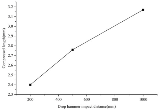 The degree of battery deformation increased significantly as the impact height increased, and leakage frequently occurred during the deformation process. Furthermore, the extent of leakage escalated with the increasing impact energy. Figure 11 illustrates how the compression length of the impacted surface of each battery varied with the height of the falling hammer. According to Figure 11, the battery deformation was not directly proportional to the impact force; as the height of the falling hammer increased, the growth trend of the compression amount gradually slowed down, indicating that the battery’s ability to resist impact deformation was gradually enhancing [16].