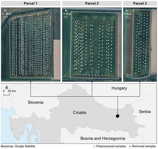 The study area included three maize parcels located in the proximity of near Koška in Eastern Croatia (Figure 1). The Koška region in eastern Croatia is characterized by a continental climate with hot summers and moderately cold winters (Dfb according to Köppen climate classification), making it suitable for maize cultivation []. Annual precipitation averages 650–800 mm, with the majority occurring during the growing season (April–October) [], while soils in the study area are predominantly clay loam []. Elevation ranges from 90 to 120 m above sea level, usually with minimal slope.