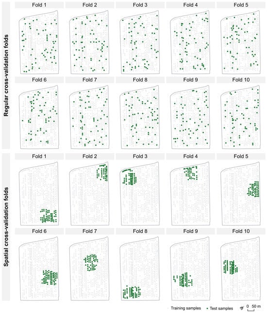 Model training and accuracy assessment were performed using 10-fold cross-validation in five repetitions to reduce variance and improve model stability. To provide a comparative assessment for general and spatial aspects of data structure, both regular and spatial cross-validation were evaluated. Regular folds were determined randomly, while spatial folds were determined using the CAST R package [], based on k-means clustering on E and N coordinates of yield samples in the Croatian Terrestrial Reference System (HTRS96/TM, EPSG: 3765), enabling evaluation across spatially distinct subfield sections (Figure 2). Input samples were clustered in 10 clusters to match the k-fold number of cross-validation, which was the sole parameter used for the creation of spatial folds. Wilcoxon tests were used to evaluate if there were significant differences in accuracy assessment metrics between regular and spatial cross-validation, using metrics from all calculated folds in the study.
