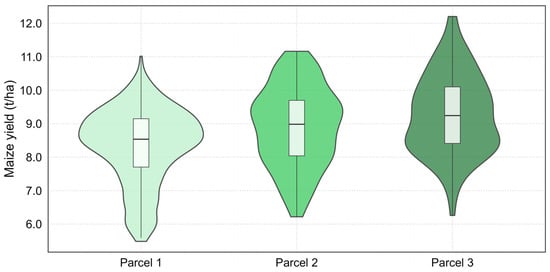 All three parcels in the study area had their median value in the range of 8.5–9.3 t/ha (Figure 3). Additionally, subfield variability in maize yield is notable, as collected maize yields across the study area ranged from 5.5 to 12.2 t/ha, with the highest frequency in yield samples of around 8.6 t/ha for Parcel 1, around 9.5 t/ha for Parcel 2, and 8.3 t/ha for Parcel 3.