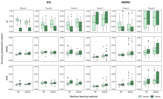 Figure 4 presents value ranges of accuracy assessment metrics per fold in 10-fold cross-validation across all five repetitions, quantifying the effect of randomness in training and test data split during cross-validation on machine learning prediction accuracy. The robustness of predictions increased with the total number of available yield samples per parcel and vegetation index, with EVI in Parcel 1 producing the most stable prediction accuracy values. On the contrary, while WDRVI produced the most accurate prediction models for Parcels 1 and 2, very low sample counts produced very high ranges in resulting accuracy assessment metrics, which was the most pronounced for R2.