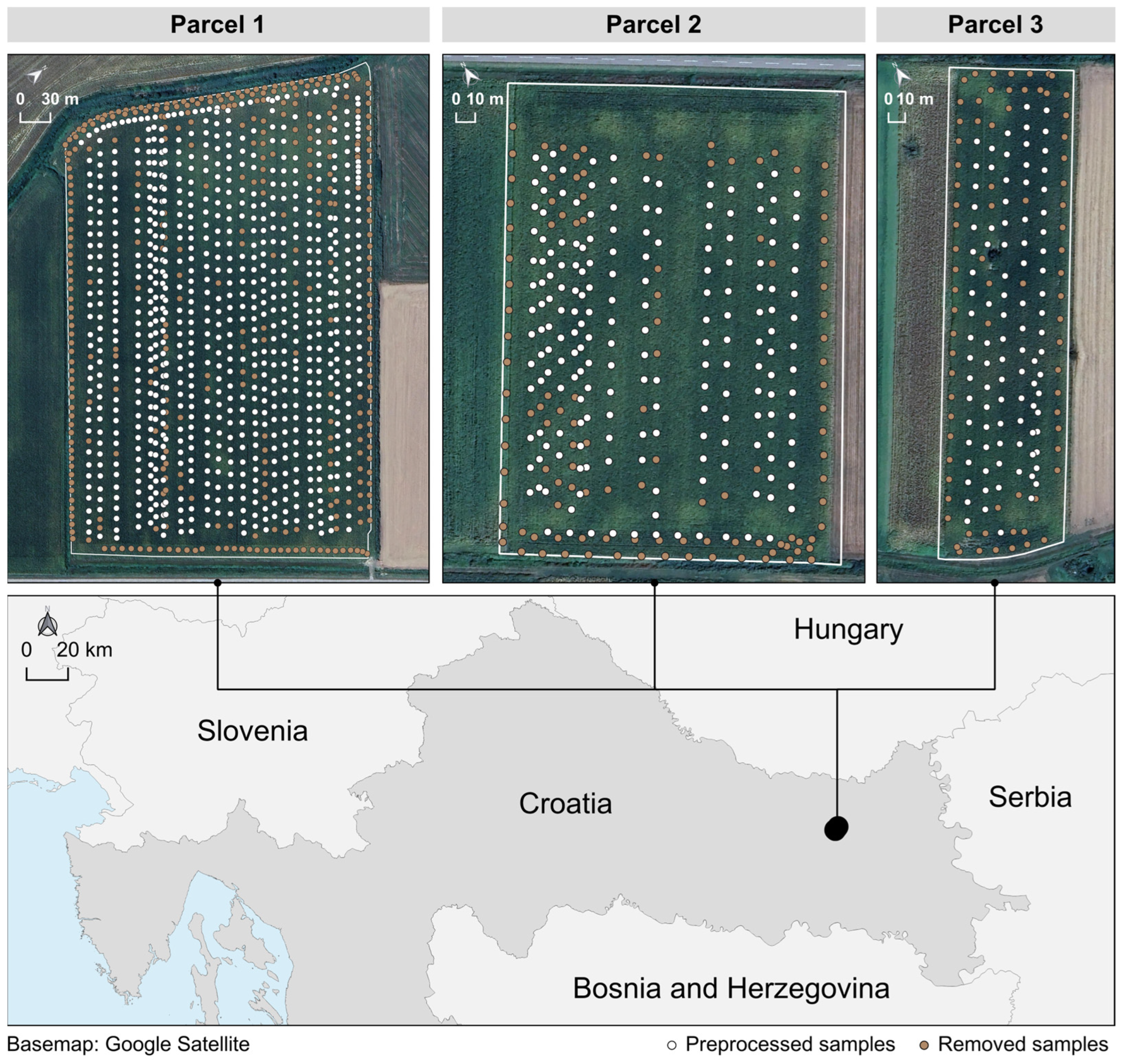 Maize yield samples were collected during harvest from 13 to 14 October 2023 using a Claas Lexion 6900 combine harvester (Harsewinkel, Germany) with a Quantimeter yield sensor and Claas Connect software v1.0 (Harsewinkel, Germany) [34], which was calibrated according to the standard procedure stated by the manufacturer. The maize yield was measured in t/ha. The combined area of the three analyzed parcels was 18.0 ha, with a total of 1566 collected georeferenced yield samples before preprocessing (Table 1). The preprocessing was performed using the paar package in R v4.5.0 [35] according to procedure outlined by Paccioretti et al. [36]. It included spatial-statistical filtering in three steps: (1) edge removal, which excluded removing samples distanced 10 m or less from parcel boundaries to reduce border effects from mechanical operations; (2) outlier removal, which identified and removed extreme values outside three standard deviations from the mean yield value per parcel; and (3) inlier removal, which detected and excluded spatially inconsistent values that deviate from local trends quantified by the local Moran index. Additionally, the Shapiro–Wilk normality test was performed for all input samples, suggesting that only yield samples from Parcel 3 had normal distribution, while the coefficient of variation was notably lower for all three parcels after preprocessing.