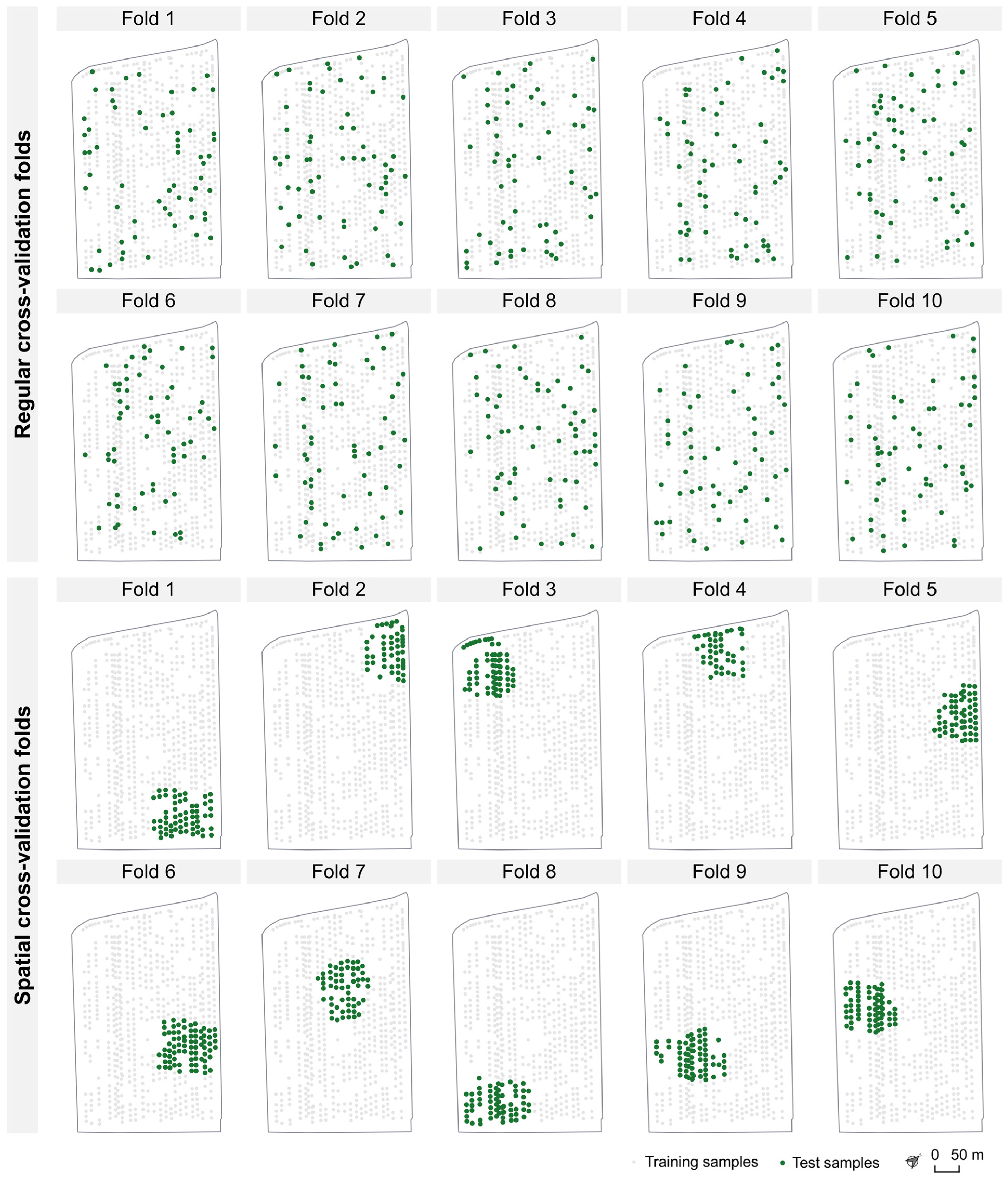 Spatial cross-validation likely captured the effects of spatial autocorrelation, unlike regular cross-validation, thus providing a more realistic and conservative estimate of model generalizability in geospatial applications. Cross-validation results were sensitive to training/test split randomness, especially under low sample counts, reinforcing the importance of repeated validation with sufficient sample size. Therefore, ignoring spatial structure during model evaluation can lead to misleading conclusions, which may negatively affect precision agriculture decision-making.