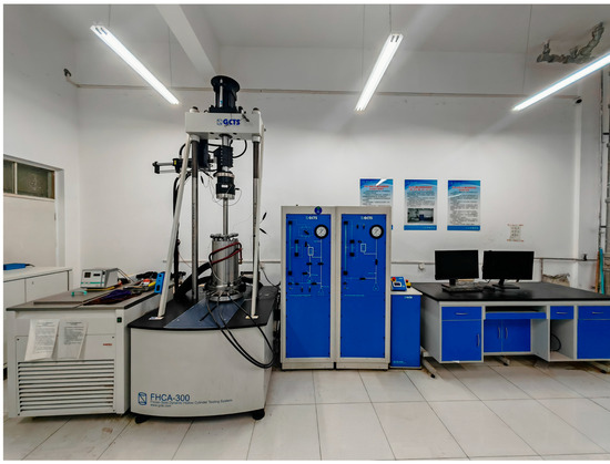 A frozen soil hollow cylinder apparatus (FHCA-300) was employed to investigate the mechanical properties of frozen soil under principal stress axis rotation (Figure 2). The device allows independent control of four loading parameters—axial force (), torque (), internal pressure (), and external pressure ()—as well as four corresponding stress variables: mean principal stress (), intermediate principal stress coefficient (), major principal stress direction angle (), and deviatoric stress ().