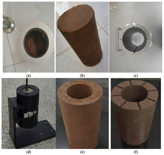 The prepared mixture was divided into 10 equal portions and compacted sequentially into a cylindrical mold, with each layer compacted to a thickness of 2 cm (Figure 3a,b). The hollow specimen was subsequently extracted from the mold using a scraping cutter (core-taking device). The final specimen measured 200 mm in height, 100 mm in outer diameter, 60 mm in inner diameter, and 20 mm in wall thickness (Figure 3c–e). To ensure reliable contact between the specimen and the jaw vanes of the hollow cylinder apparatus, shallow grooves were cut on the top and bottom surfaces of the specimen (Figure 3f). The specimen was then carefully aligned within the apparatus so that the vanes were firmly positioned against the grooved surfaces. During compaction, special attention was given to achieving uniform contact and eliminating potential air gaps. The specimen was further monitored during loading to confirm that the vanes maintained a stable grip throughout the test. The complete specimen preparation procedure is illustrated in Figure 3.