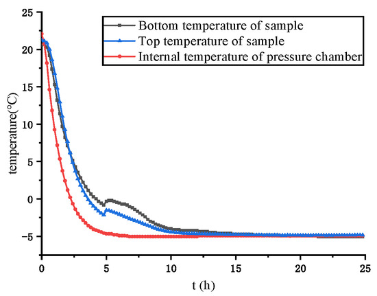 During the directional shear tests on frozen soil, the specimens were maintained at low temperatures, and the cooling process prior to testing is shown in Figure 5. Once a target temperature was set, the sample temperature was allowed to decrease until equilibrium was reached. To provide a reference for comparison with the frozen state, only one room-temperature test was conducted under the conditions of mean principal stress p = 200 kPa, intermediate principal stress coefficient b = 0.5, principal stress axis angle = 40°, and a shear stress rate of 2 kPa/min. Three groups of experiments were conducted: (i) temperature variation tests (T = −5, −10, and −15 °C with reference condition at 20 °C); (ii) principal stress direction angle variation tests ( = 0°, 15°, 30°, 45°, 60°, and 75°); and (iii) intermediate principal stress coefficient variation tests ( = 0, 0.25, 0.5, and 0.75) (Table 2). In this study, volumetric strain during the cooling stage was not monitored due to limitations of the experimental apparatus, which does not allow real-time volume measurements during freezing.