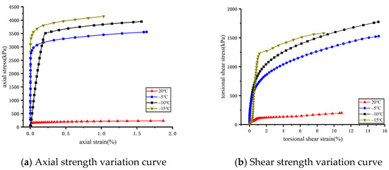 Figure 7 illustrates the relationship between axial strength and shear strength under different temperature conditions. The stress–strain curves indicate clear strain hardening with decreasing temperature, particularly under frozen states, where the torsional shear strain curves exhibit pronounced hardening. A distinct contrast in strength was observed between the unfrozen condition (20 °C) and the frozen states (−5 °C, −10 °C, and −15 °C) (Figure 7a,b).
