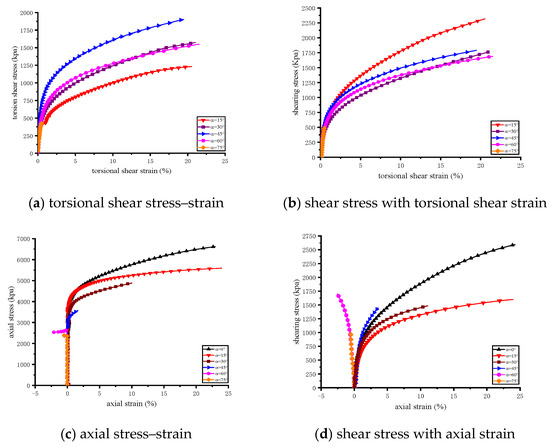 Figure 8 presents the variations of torsional shear strain and axial strain under different angles of the major principal stress. Figure 8a,b illustrate the relationships between torsional shear stress and torsional shear strain, while Figure 8c,d depict axial stress and shear stress versus axial strain. The stress–strain responses exhibited strain hardening across different θ values. At θ = 0°, the major principal stress was aligned with the axial direction, resulting in no torsional shear strain since torsional loading was absent.