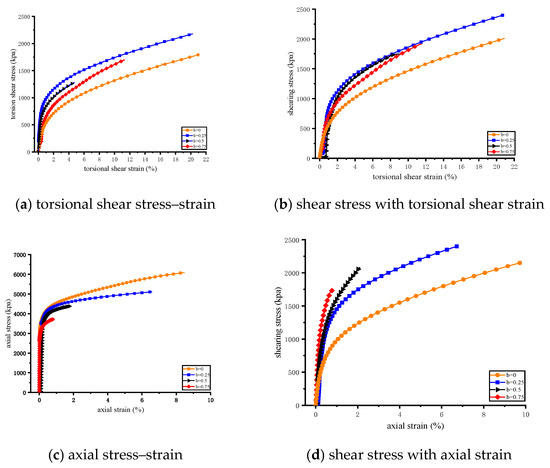 Figure 9 illustrates the stress–strain responses of frozen soil under different intermediate principal stress coefficients (b = 0, 0.25, 0.5, and 0.75). Figure 9a,b show the relationships of torsional shear stress and shear stress with torsional shear strain, while Figure 9c,d depict axial stress and shear stress versus axial strain. Overall, strain hardening was observed with increasing b values.