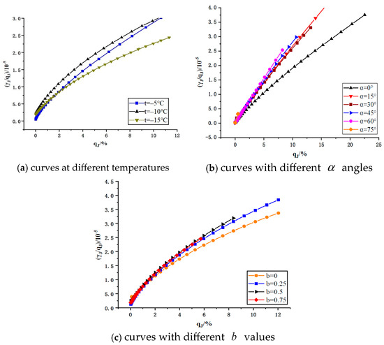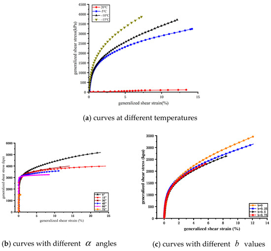 To further analyze the strength model of loess under freezing conditions, the generalized shear stress–strain curves obtained from the directional shear stress path were plotted under different parameters, as shown in Figure 12.