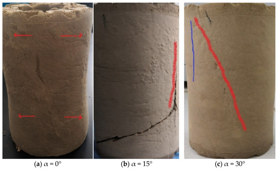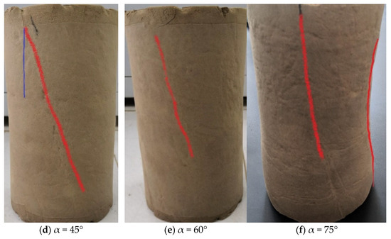 As shown in Figure 11, the frozen soil specimens subjected to directional shear tests under different principal stress axis angles exhibited varying degrees of deformation, most of which manifested as shear deformation with visible shear bands. The shear bands in the figures are highlighted with solid red lines. It can be observed that when the principal stress axis angle was 0°, the specimen was subjected to a vertically downward axial force without shear deformation, leading instead to peripheral expansion and splitting. When the principal stress axis angle was not 0°, the specimens all developed shear deformation to different extents. The deformation was concentrated in narrow localized zones, forming inclined shear bands on the specimen surface, which affected the soil strength and reduced its bearing capacity. At principal stress axis angles of 30° and 45°, the shear bands were more pronounced, and the specimens exhibited greater deformation in the torsional shear direction. At 60° and 75°, slight surface extrusion occurred, and the shear band development was relatively moderate.