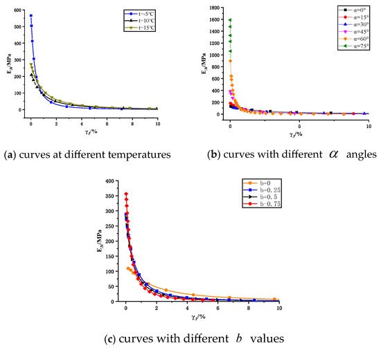 The graph of the obtained generalized shear modulus versus generalized shear strain is presented in Figure 13. It can be observed that with the gradual increase in strain, the generalized shear modulus generally exhibited a decreasing trend. The influence of stress parameter variations on the initial generalized shear modulus () was more pronounced. Specifically,