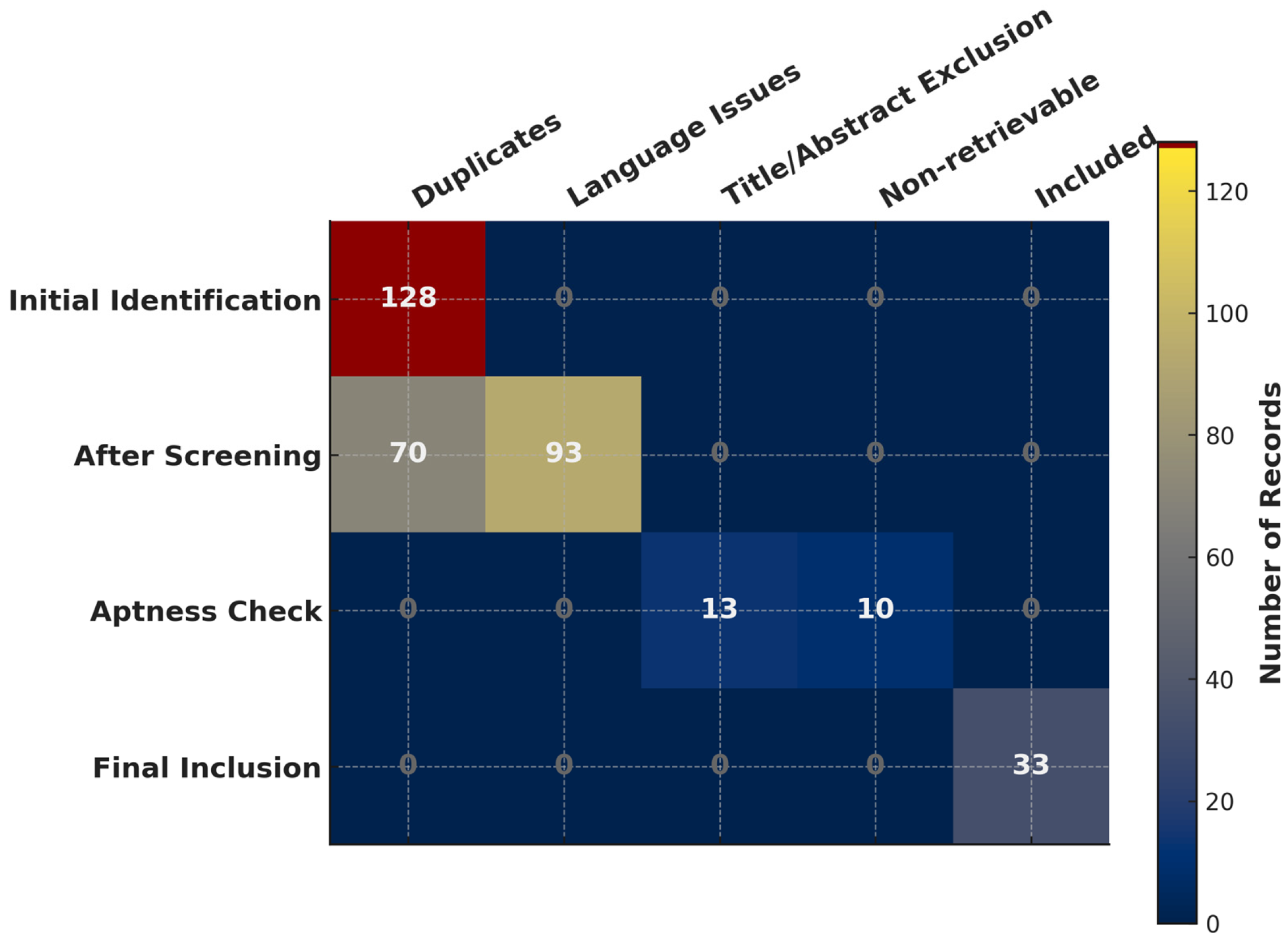 To systematically structure and present the literature screening and synthesis process, we adopted an Evidence Gap Map (EGM) approach. EGMs provide a matrix-based visualization of where evidence exists and where gaps remain, rather than a flowchart of article selection. In this study, the rows represent stages of the review process (identification, screening, eligibility, inclusion), while the columns indicate reasons for exclusion or successful inclusion. The density of studies within each cell highlights concentrations of evidence and areas where research is lacking. The EGM diagram illustrating the inclusion and exclusion process during article selection is presented in Figure 7.