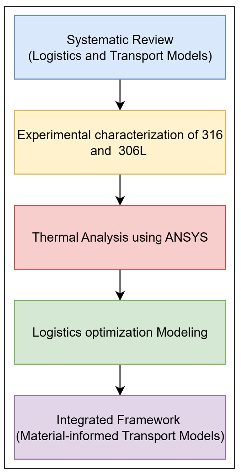 To unify the review, experimental, and modeling strands, a workflow schematic was developed, as shown in Figure 8. This diagram illustrates how the three methodological components converge: (i) the systematic review defines the scope of logistics models, (ii) experimental results supply validated material inputs, and (iii) simulations link these properties to logistics optimization. Together, this integrated workflow ensures that logistics frameworks are not abstract but grounded in stainless steel’s engineering realities.