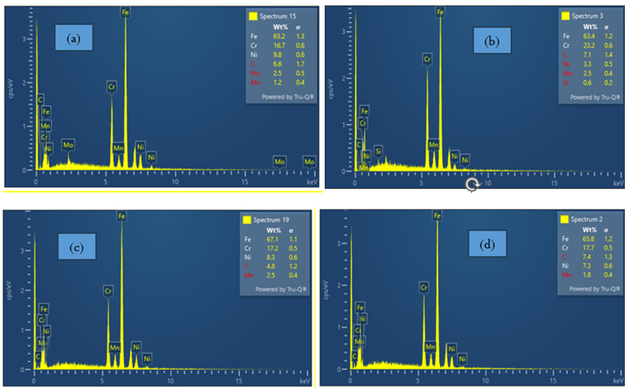 Figure 12. Elemental weight percentage results of all the SS grades derived from X-ray fluorescence (XRF). (a) 316 annealed at 1040 °C followed by water quenching, (b) 316 isothermal annealing at 700 °C, (c) 304L annealed at 1040 °C followed by water quenching, and (d) 304L isothermal annealing at 700 °C.
