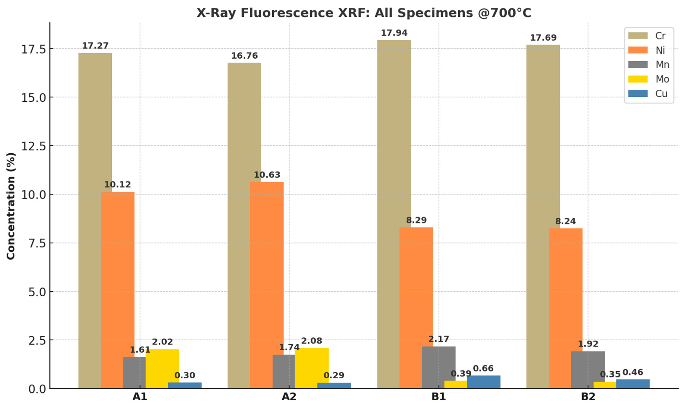 Replicated XRF measurements across specimens A1, A2, B1, and B2 yielded the above mean compositions (±SD, with 95% CI). These intervals quantify variability and confirm that Cr, Ni, and Mn remain within expected engineering ranges, while Mo and Cu exhibit higher dispersion.