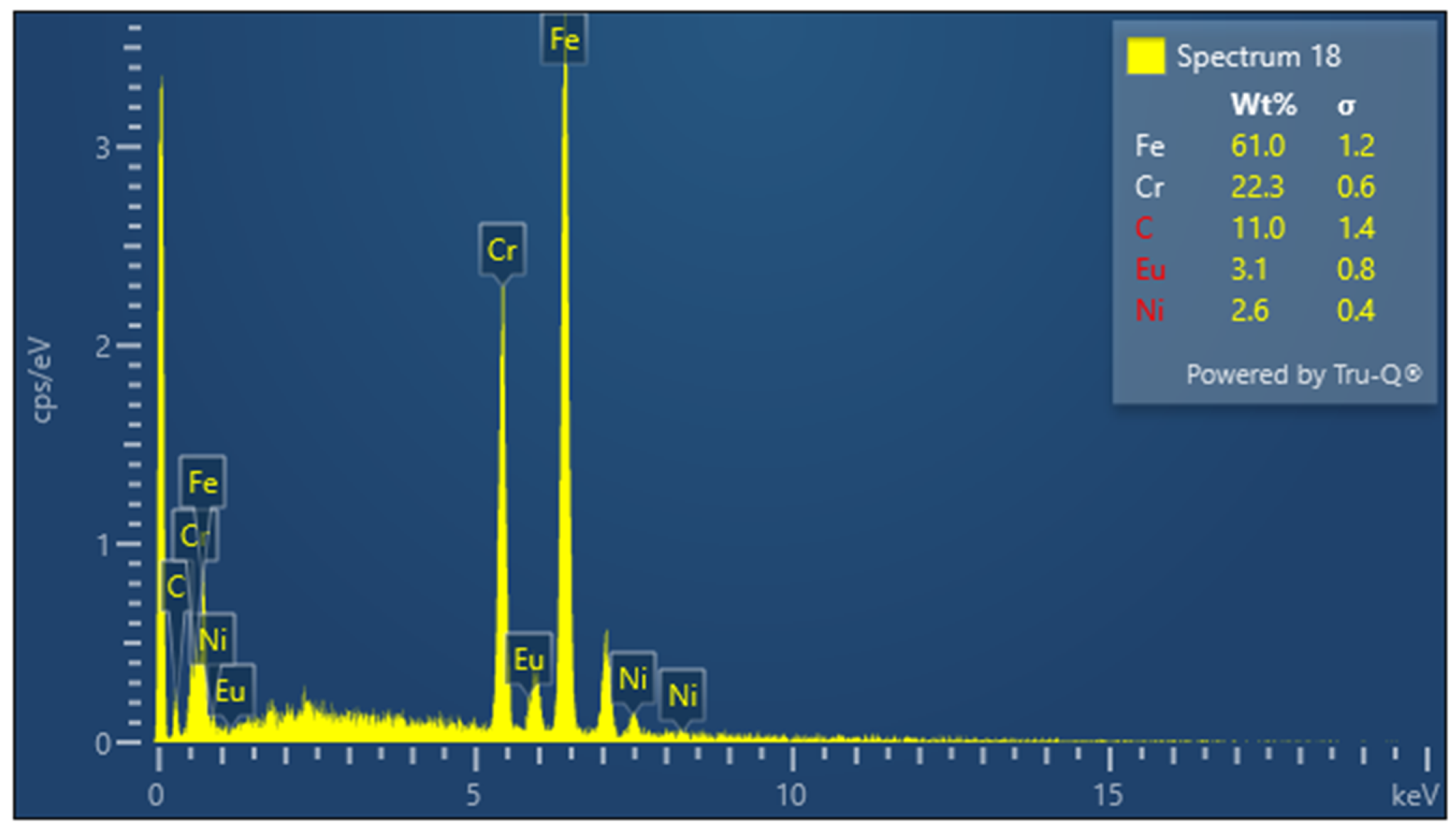 For reporting, detection limits, and uncertainty, elemental results are now reported in wt.% and at%. Typical EDS detection limits in this configuration were ~0.1–0.3 wt.% for mid-Z (atomic number) elements and ~0.5–1.0 wt.% for light elements (e.g., C). Expanded uncertainty (≈95%) combines repeatability, calibration, and counting statistics, yielding ±0.2–0.3 wt.% for major constituents (Cr, Ni) and ±0.5–1.0 wt.% for minor/light elements (Mn, Mo, Cu, C). Values below LOD are flagged as “< LOD” rather than zero.