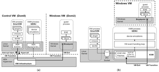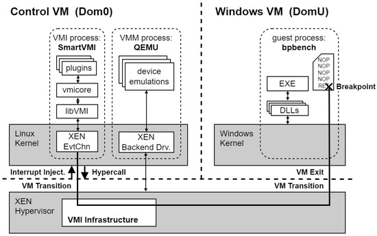 In this paper, we considered only the XEN hypervisor because the breakpoint approaches either already existed for Xen or were easy to implement (SmartVMI instruction emulation). The only working implementation for introspection with KVM is SmartVMI’s default instruction-repair mechanism. DRAKVUF is not compatible with KVM, and we are unsure how much work it would take to make the two compatible. According to the maintainer, SmartVMI supports EPT switching, so implementing DRAKVUF’s altp2m approach in SmartVMI should be possible (see https://github.com/GDATASoftwareAG/smartvmi/issues/140#issue-2046303351, accessed on 2 September 2025). SmartVMI’s instruction emulation, which we implemented for XEN, does not directly work with KVM because LibVMI is missing the implementation for instruction emulation. However, SmartVMI’s read emulation is functional with KVM, so we hope the required changes in LibVMI and KVMI are small and that we will be able to implement instruction-emulation-based breakpoint handling for KVM soon.