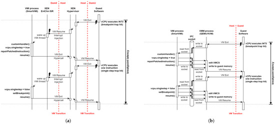 Control flow sequence of the instruction-repair breakpoint-handling mechanism (a) on a XEN type 1 hypervisor (b) on a KVM type 2 hypervisor.