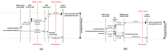 Control flow sequence of the instruction emulation breakpoint heandling mechanism. (a) On XEN type 1 hypervisor. (b) On KVM type 2 hypervisor.