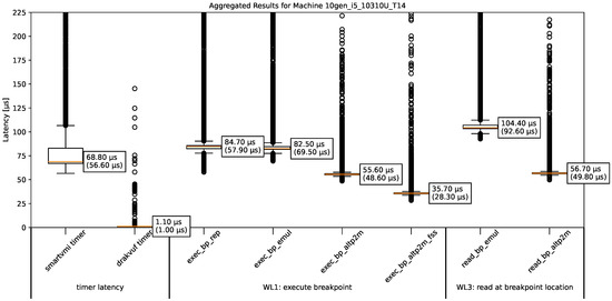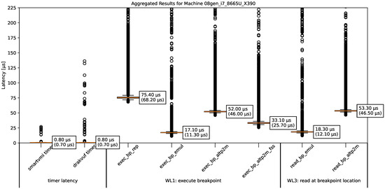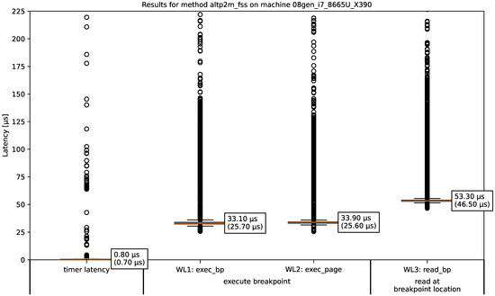 Figure 5 displays a box plot of the execution times of the SLAT View switching method for both breakpoint handling (breakpoint execution) and breakpoint hiding (breakpoint reading), as measured on the ThinkPad X390 (i7 8665U) system. The plot is an example. Corresponding plots also exist for all other methods and systems (measurement results are publicly available in raw and aggregated forms, as are plots at https://github.com/lbeierlieb/bpbench_measurement_study/tree/f441dfda25e4ee7ef07c122fa3efa15fa1eabfab/plots/individual (accessed on 9 September 2025)).