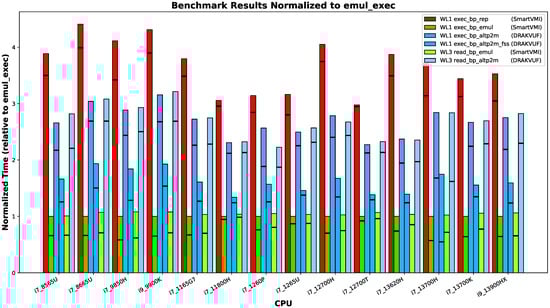 Since the exec_bp_emul mechanism was the fastest in all experiments on all machines, it can be used as a baseline for normalizing the time measurements of all methods. However, this requires removing from the dataset all machines for which no valid measurements are available for the exec_bp_emul method because of suspicious timer latencies, as discussed in Section 7.3. Figure 9 displays the normalized results.